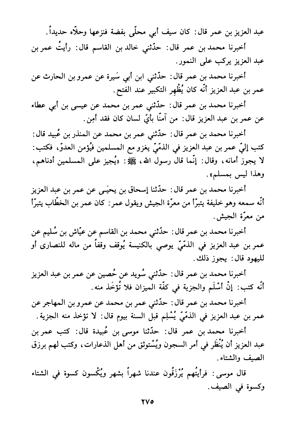 أَخْبَرَنَا مُحَمَّدُ بْنُ عُمَرَ قَالَ: حَدَّثَنِي خَالِدُ بن الْقَاسِمِ قَالَ: رَأَيْتُ عُمَرَ بْنَ عَبْدِ الْعَزِيزِ يَرْكَبُ عَلَى النُّمُورِ.
