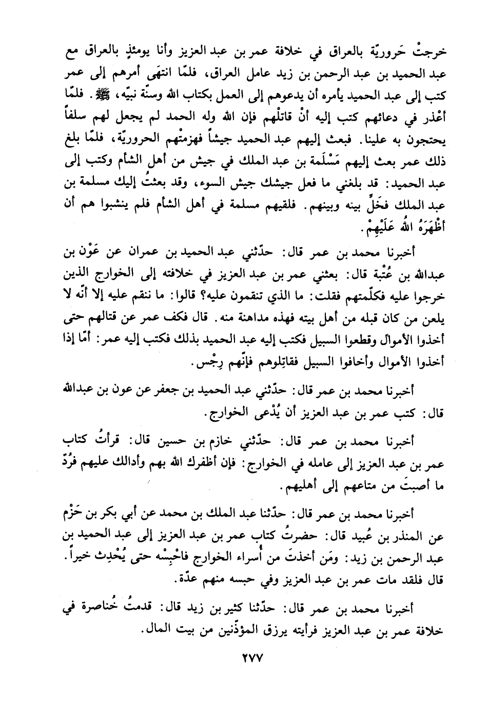 خَرَجَتْ حَرُورِيَّةٌ بِالْعِرَاقِ فِي خِلافَةِ عُمَرَ بْنِ عَبْدِ الْعَزِيزِ وَأَنَا يَوْمَئِذٍ بِالْعِرَاقِ مَعَ عَبْدِ الْحَمِيدِ بْنِ عَبْدِ الرَّحْمَنِ بْنِ زَيْدٍ عَامَلِ الْعِرَاقِ. فَلَمَّا انْتَهَى أَمْرُهُمْ إِلَى عُمَرَ كَتَبَ إِلَى عَبْدِ الْحَمِيدِ يَأْمُرُهُ أَنْ يَدْعُوَهُمَ إِلَى الْعَمَلِ بِكِتَابِ اللَّهِ وَسُنَّةَ نَبِيِّهِ - صَلَّى اللَّهُ عَلَيْهِ وَسَلَّمَ - فَلَمَّا أُعْذِرَ فِي دُعَائِهِمْ كَتَبَ إِلَيْهِ أَنْ قَاتِلْهُمْ فَإِنَّ اللَّهَ وَلَهُ الْحَمْدُ لَمْ يَجْعَلْ لَهُمْ سَلَفًا يَحْتَجُّونَ بِهِ عَلَيْنَا. فَبَعَثَ إِلَيْهِمْ عَبْدُ الْحَمِيدِ جَيْشًا فَهَزَمَتْهُمُ الْحَرُورِيَّةُ. فَلَمَّا بَلَغَ ذَلِكَ عُمَرَ بَعَثَ إِلَيْهِمْ مَسْلَمَةَ بْنَ عَبْدِ الْمَلِكِ فِي جَيْشٍ مِنْ أَهْلِ الشَّامِ وَكَتَبَ إِلَى عَبْدِ الْحَمِيدِ: قَدْ بَلَغَنِي مَا فَعَلَ جَيْشُكَ جَيْشُ السُّوءِ. وَقَدْ بَعَثْتُ إِلَيْكَ مَسْلَمَةَ بْنَ عَبْدِ الْمَلِكِ فَخَلِّ بَيْنَهُ وَبَيْنَهُمْ. فَلَقِيَهُمْ مَسْلَمَةُ فِي أَهْلِ الشَّامِ فَلَمْ يَنْشَبُوا هُمْ أَنْ أَظْهَرَهُ اللَّهُ عَلَيْهِمْ.