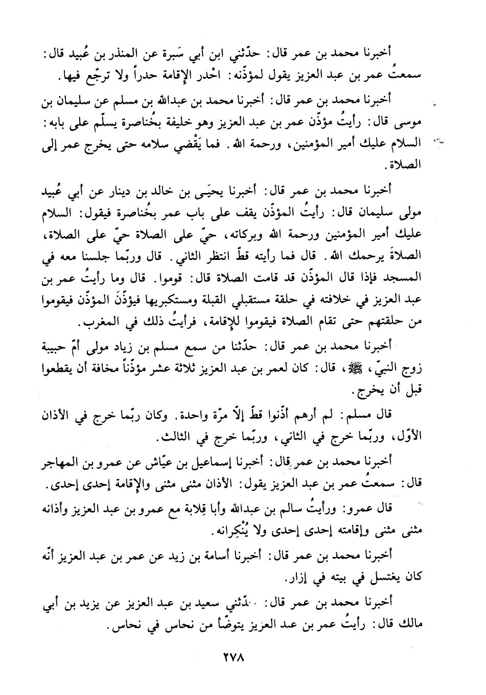 الصَّلاةَ يَرْحَمُكَ اللَّهُ. قَالَ فَمَا رَأَيْتُهُ قَطُّ انْتَظَرَ الثَّانِي. قَالَ وَرُبَّمَا جَلَسْنَا مَعَهُ فِي الْمَسْجِدِ فَإِذَا قَالَ الْمُؤَذِّنُ قَدْ قَامَتِ الصَّلاةُ قَالَ: قُومُوا. قَالَ وَمَا رَأَيْتُ عُمَرَ بْنَ عَبْدِ الْعَزِيزِ فِي خِلافَتِهِ فِي حَلْقَةٍ مُسْتَقْبِلِي الْقِبْلَةَ وَمُسْتَكْبِرِيهَا فَيُؤَذِّنُ الْمُؤَذِّنُ فَيَقُومُوا مِنْ حَلْقَتِهِمْ حَتَّى تُقَامَ الصَّلاةُ فَيَقُومُوا لِلإِقَامَةِ. فَرَأَيْتُ ذَلِكَ فِي الْمَغْرِبِ.