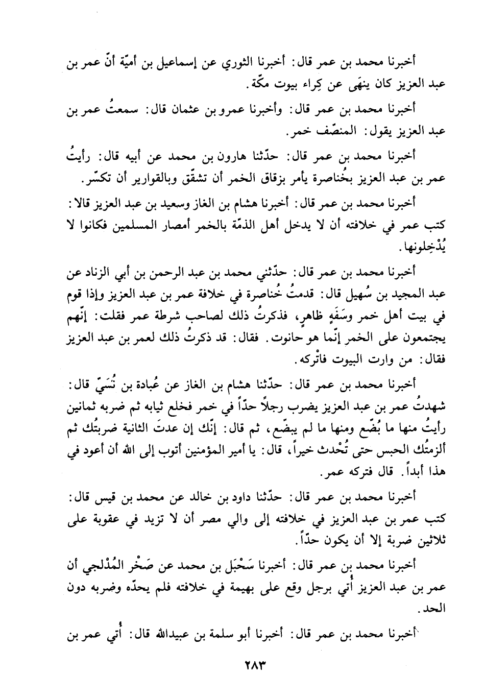 أَخْبَرَنَا مُحَمَّدُ بْنُ عُمَرَ قَالَ: حَدَّثَنِي مُحَمَّدُ بْنُ عَبْدِ الرَّحْمَنِ بْنِ أَبِي الزِّنَادِ عَنْ عَبْدِ الْمَجِيدِ بْنِ سُهَيْلٍ قَالَ: قَدِمْتُ خُنَاصِرَةَ فِي خِلافَةِ عُمَرَ بْنِ عَبْدِ الْعَزِيزِ وَإِذَا قَوْمٌ فِي بَيْتِ أَهْلِ خَمْرٍ وَسَفِهٍ ظَاهَرٍ. فَذَكَرْتُ ذَلِكَ لِصَاحِبِ شُرْطَةِ عُمَرَ فَقُلْتُ: إِنَّهُمْ يَجْتَمِعُونَ عَلَى الْخَمْرِ إِنَّمَا هُوَ حَانُوتٌ. فَقَالَ: قَدْ ذَكَرْتُ ذَلِكَ لِعُمَرَ بْنِ عَبْدِ الْعَزِيزِ فَقَالَ: مَنْ وَارَتِ الْبُيُوتَ فَاتْرُكْهُ.