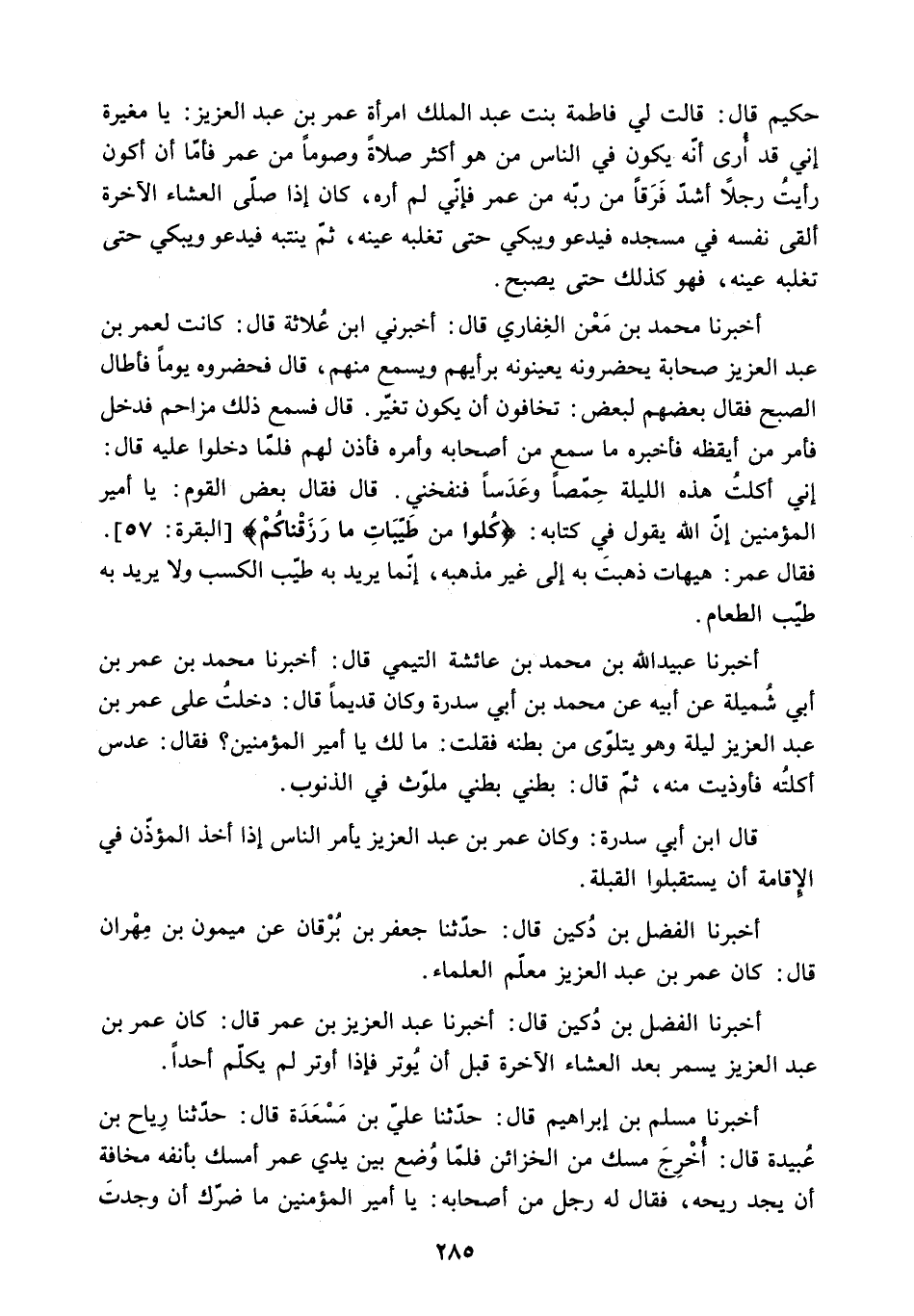 حَكِيمٍ قَالَ: قَالَتْ لِي فَاطِمَةُ بِنْتُ عَبْدِ الْمَلِكِ امْرَأَةُ عُمَرَ بْنِ عَبْدِ الْعَزِيزِ: يَا مُغِيرَةُ إِنِّي قَدْ أُرَى أَنَّهُ يَكُونُ فِي النَّاسِ مَنْ هُوَ أَكْثَرُ صَلاةً وَصَوْمًا مِنْ عُمَرَ فَأَمَّا أَنْ أَكُونَ رَأَيْتُ رَجُلا أَشَدَّ فَرَقًا مِنْ رَبِّهِ مِنْ عُمَرَ فَإِنِّي لَمْ أَرَهْ. كَانَ إِذَا صَلَّى الْعِشَاءَ الآخِرَةَ أَلْقَى نَفْسَهُ فِي مَسْجِدِهِ فَيَدْعُو وَيَبْكِي حَتَّى تَغْلِبَهُ عَيْنُهُ. ثُمَّ يَنْتَبِهُ فَيَدْعُو وَيَبْكِي حَتَّى تَغْلِبَهُ عَيْنُهُ. فَهُوَ كَذَلِكَ حَتَّى يُصْبِحَ.