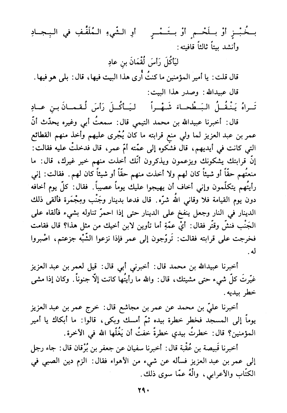 أَخْبَرَنَا قَبِيصَةُ بْنُ عُقْبَةَ قَالَ: أَخْبَرَنَا سُفْيَانُ عن جَعْفَرِ بْنِ بُرْقَانَ قَالَ: جَاءَ رَجُلٌ إِلَى عُمَرَ بْنِ عَبْدِ الْعَزِيزِ فَسَأَلَهُ عَنْ شَيْءٍ مِنَ الأَهْوَاءِ فَقَالَ: الْزَمْ دِينَ الصَّبِيِّ فِي الْكُتَّابِ وَالأَعْرَابِيِّ. وَالْهُ عَمَّا سِوَى ذَلِكَ.