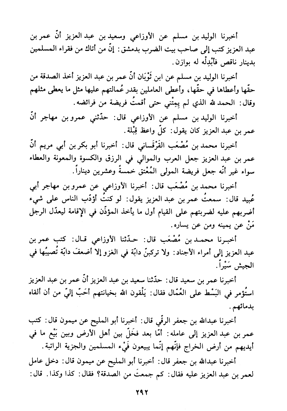 أَخْبَرَنَا الْوَلِيدُ بْنُ مُسْلِمٍ عَنِ ابْنِ ثَوْبَانَ أَنَّ عُمَرَ بْنَ عَبْدِ الْعَزِيزِ أَخَذَ الصَّدَقَةَ مِنْ حَقِّهَا وَأَعْطَاهَا فِي حَقِّهَا. وَأَعْطَى الْعَامِلِينَ بِقَدْرِ عِمَالَتِهِمْ عَلَيْهَا مِثْلَ مَا يُعْطَى مِثْلَهُمْ وَقَالَ: الْحَمْدُ لِلَّهِ الَّذِي لَمْ يُمِتْنِي حَتَّى أَقَمْتُ فَرِيضَةً مِنْ فَرَائِضِهِ.