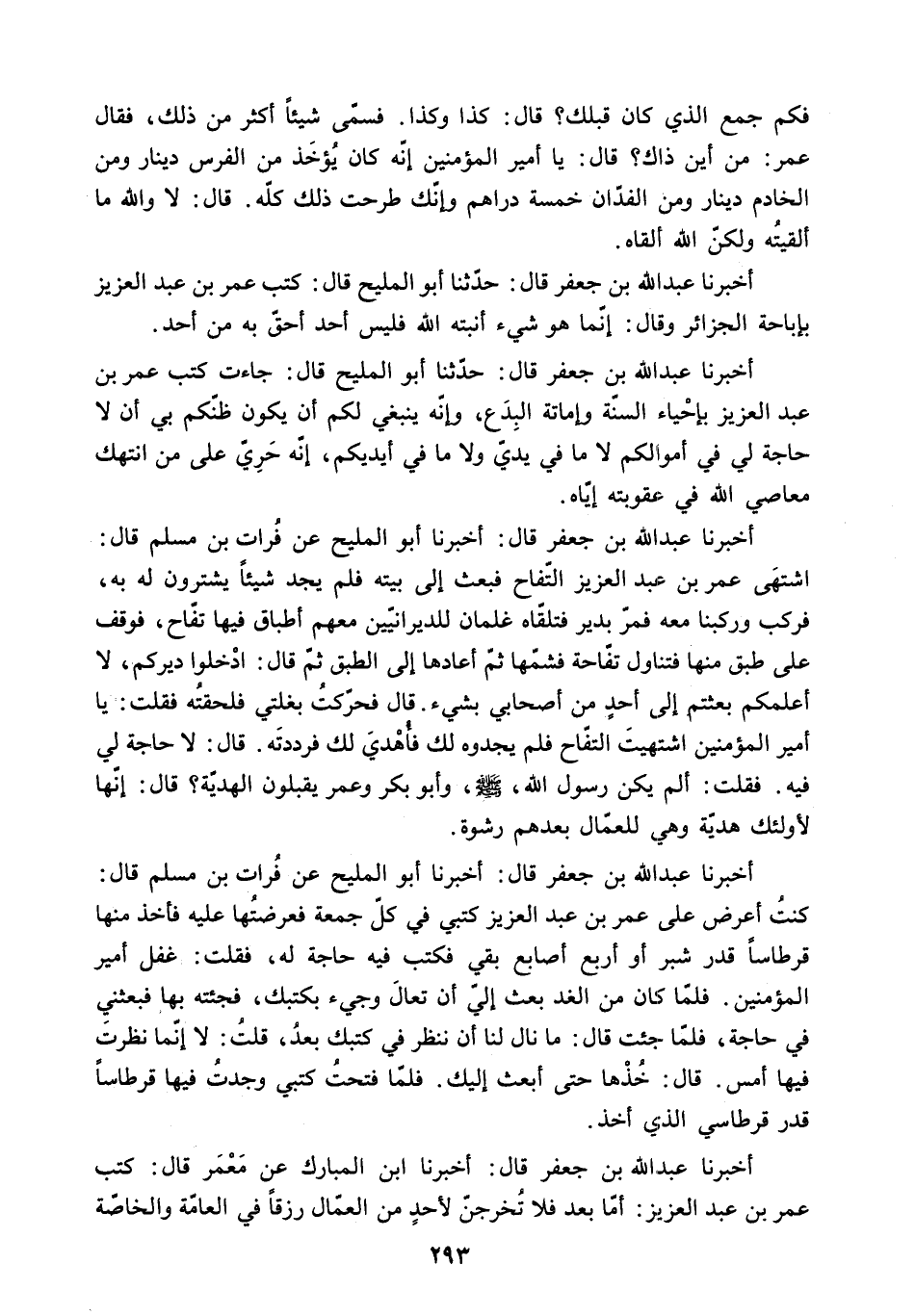 أَخْبَرَنَا عَبْدُ اللَّهِ بْنُ جَعْفَرٍ قَالَ: حَدَّثَنَا أَبُو الْمَلِيحِ قَالَ: جَاءَتْ كُتُبُ عُمَرَ بْنِ عَبْدِ الْعَزِيزِ بِإِحِيَاءِ السُّنَّةِ وَإِمَاتَةِ الْبِدَعِ. وَإِنَّهُ يَنْبَغِي لَكُمْ أَنْ يَكُونَ ظَنُّكُمْ بِي أَنْ لا حَاجَةَ لِي فِي أَمْوَالِكُمْ لا مَا فِي يَدَيَّ وَلا مَا فِي أَيْدِيكُمْ. إِنَّهُ حَرِيٌّ عَلَى مَنِ انْتَهَكَ مَعَاصِي اللَّهِ فِي عُقُوبَتِهِ إِيَّاهُ.