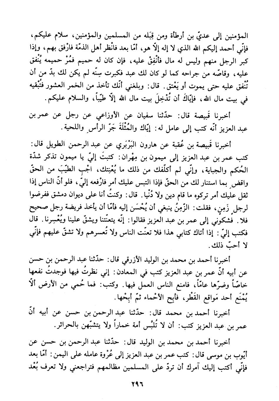 فَإِنِّي أَحْمَدُ إِلَيْكُمُ اللَّهَ الَّذِي لا إِلَهَ إِلا هُوَ. أَمَّا بَعْدُ فَانْظُرْ أَهْلَ الذِّمَّةِ فَارْفُقْ بِهِمْ. وَإِذَا كَبِرَ الرَّجُلُ مِنْهُمْ وَلَيْسَ لَهُ مَالٌ فَأَنْفِقْ عَلَيْهِ. فَإِنْ كَانَ لَهُ حَمِيمٌ فَمُرْ حَمِيمَهُ يُنْفِقُ عَلَيْهِ. وَقَاصِّهِ مِنْ جِرَاحِهِ كَمَا لَوْ كَانَ لَكَ عَبْدٌ فَكَبِرَتْ سِنُّهُ لَمْ يَكُنْ لَكَ بُدٌّ مِنْ أَنْ تُنْفِقَ عَلَيْهِ حَتَّى يَمُوتَ أَوْ يُعْتَقَ. قَالَ: وَبَلَغَنِي أَنَّكَ تأخذ من الخمر العشور فَتُبْقِيهِ فِي بَيْتِ مَالِ اللَّهِ. فَإِيَّاكَ أَنْ تُدْخِلَ بَيْتَ مَالِ اللَّهِ إِلا طَيِّبًا. وَالسَّلامُ عَلَيْكُمْ.
