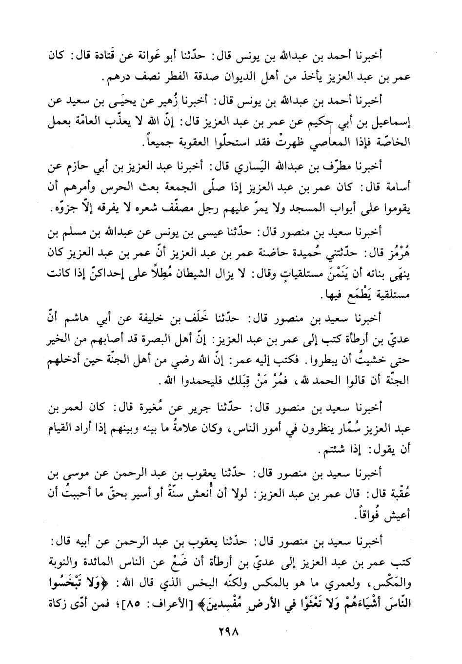 كَتَبَ عُمَرُ بْنُ عَبْدِ الْعَزِيزِ إِلَى عَدِيِّ بْنِ أَرْطَأَةَ أَنْ ضَعْ عَنِ النَّاسِ الْمَائِدَةَ وَالنَّوْبَةَ وَالْمَكْسَ. وَلَعَمْرِي مَا هُوَ بِالْمَكْسِ وَلَكِنَّهُ الْبَخْسُ الَّذِي قَالَ اللَّهُ: «وَلا تَبْخَسُوا النَّاسَ أَشْياءَهُمْ وَلا تَعْثَوْا فِي الْأَرْضِ مُفْسِدِينَ» الأعراف: 85. فَمَنْ أَدَّى زَكَاةَ