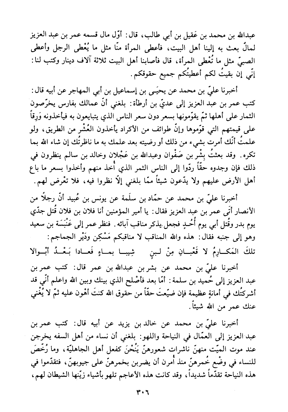 عَبْدِ اللَّهِ بْنِ مُحَمَّدِ بْنِ عَقِيلِ بْنِ أَبِي طَالِبٍ. قَالَ: أَوَّلُ مَالٍ قَسَمَهُ عُمَرُ بْنُ عَبْدِ الْعَزِيزِ لِمَالٍ بَعَثَ بِهِ إِلَيْنَا أَهْلَ الْبَيْتِ. فَأَعْطَى الْمَرْأَةَ مِنَّا مِثْلَ مَا يُعْطَى الرَّجُلُ وَأَعْطَى الصَّبِيَّ مِثْلَ مَا تُعْطَى الْمَرْأَةُ. قَالَ فَأَصَابَنَا أَهْلَ الْبَيْتِ ثَلاثَةُ آلافِ دِينَارٍ وَكَتَبَ لَنَا:
