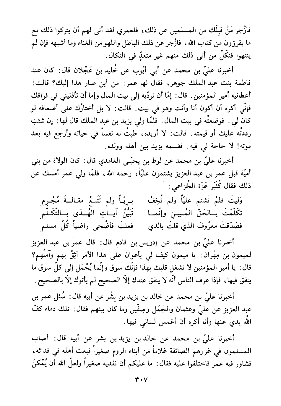 أَخْبَرَنَا عَلِيُّ بْنُ مُحَمَّدٍ عَنْ خَالِدِ بْنِ يَزِيدَ بْنِ بِشْرٍ عَنْ أَبِيهِ قَالَ: سُئِلَ عُمَرُ بْنُ عَبْدِ الْعَزِيزِ عَنْ عَلِيٍّ وَعُثْمَانَ وَالْجَمَلِ وَصِفِّينَ وَمَا كَانَ بَيْنَهُمْ فَقَالَ: تِلْكَ دِمَاءٌ كَفَّ اللَّهُ يَدَيَّ عَنْهَا وَأَنَا أَكْرَهُ أَنْ أَغْمِسَ لِسَانِي فِيهَا.