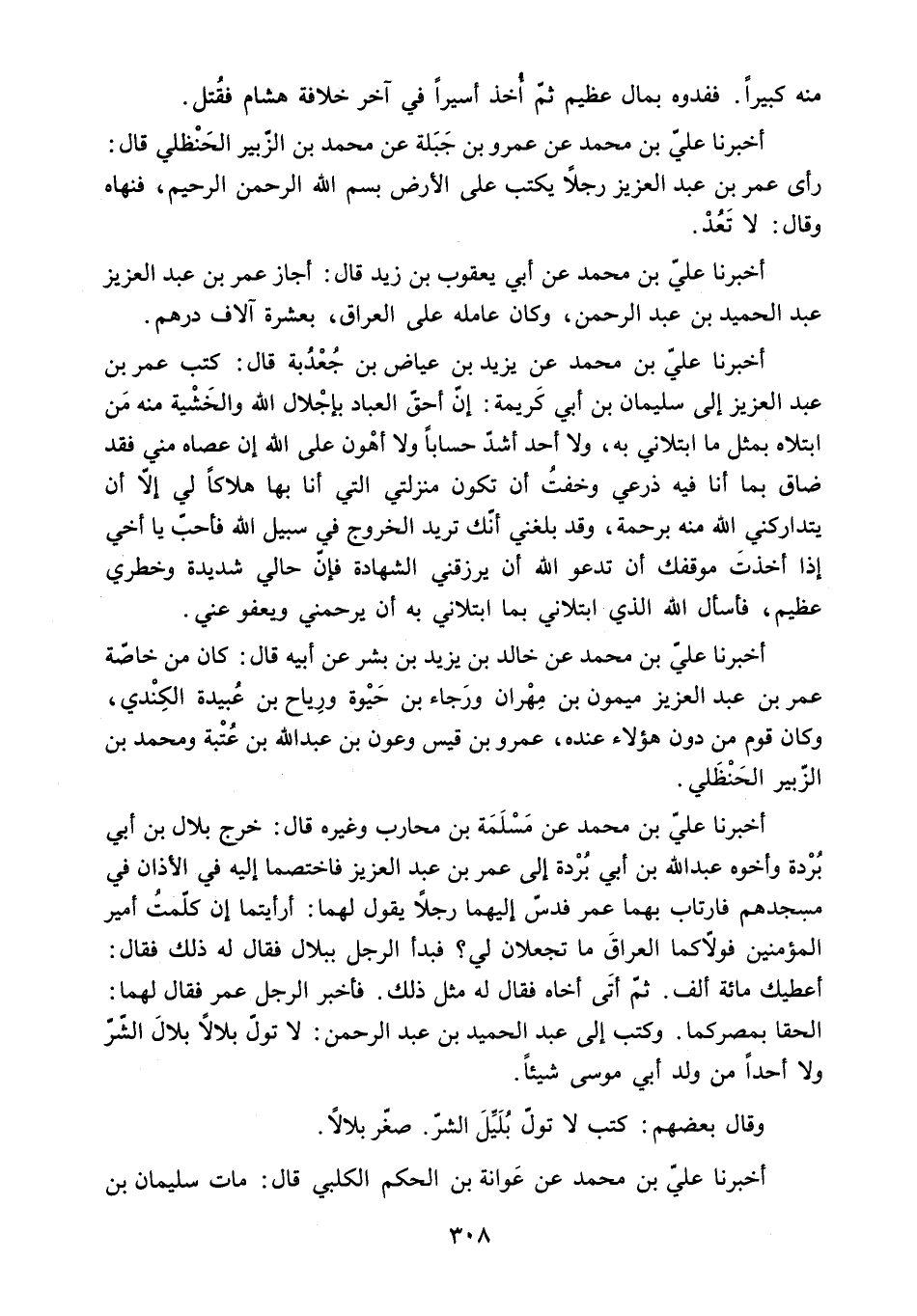 الْحَقَا بِمِصْرِكُمَا. وَكَتَبَ إِلَى عَبْدِ الْحَمِيدِ بْنِ عَبْدِ الرَّحْمَنِ: لا تُوَلِّ بِلالا بِلالَ الشَّرِّ وَلا أَحَدًا مِنْ وَلَدِ أَبِي مُوسَى شَيْئًا.