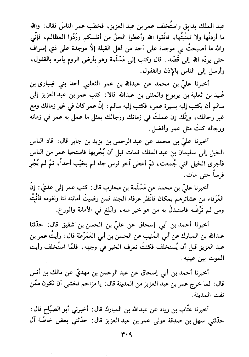 أَخْبَرَنَا عَلِيُّ بْنُ مُحَمَّدٍ عَنْ عَبْدِ اللَّهِ بْنِ عُمَرَ الثَّعْلَبِيِّ أَحَدِ بَنِي ضُبَارَى بْنِ عُبَيْدِ بْنِ ثَعْلَبَةَ بْنِ يَرْبُوعٍ وَالْمُثَنَّى بْنِ عَبْدِ اللَّهِ قَالا: كَتَبَ عُمَرُ بْنُ عَبْدِ الْعَزِيزِ إِلَى سَالِمٍ أَنْ يَكْتُبَ إِلَيْهِ بِسِيرَةِ عُمَرَ. فَكَتَبَ إِلَيْهِ سَالِمٌ: إِنَّ عُمَرَ كَانَ فِي غَيْرِ زَمَانِكَ وَمَعَ غَيْرِ رِجَالِكَ. وَإِنَّكَ إِنْ عَمِلْتَ فِي زَمَانِكَ وَرِجَالِكَ بِمِثْلِ مَا عَمِلَ بِهِ عُمَرُ فِي زَمَانِهِ وَرِجَالِهِ كُنْتَ مِثْلَ عُمَرَ وَأَفْضَلَ.