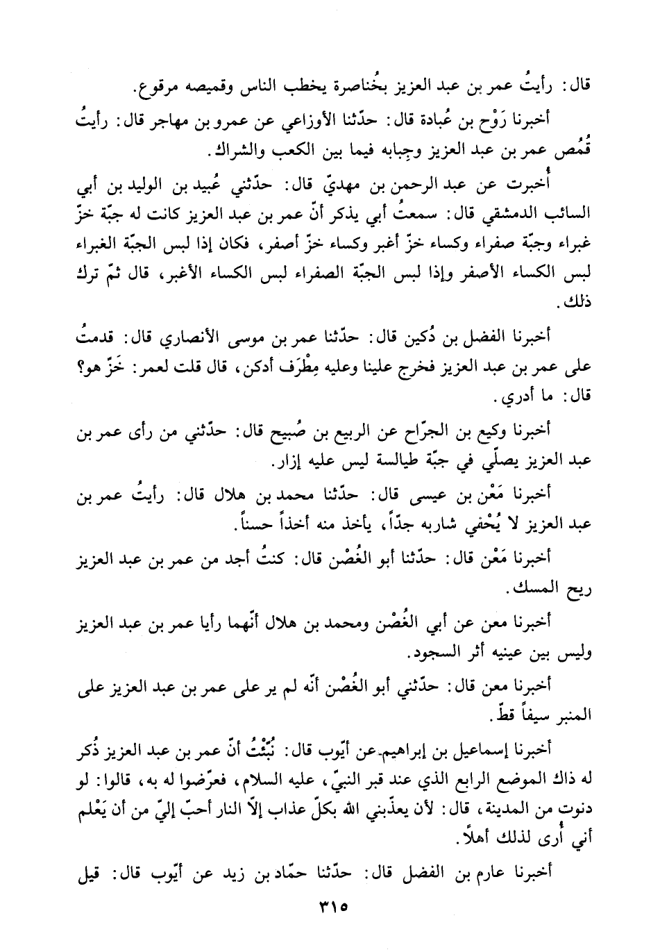 أَخْبَرَنَا إِسْمَاعِيلُ بْنُ إِبْرَاهِيمَ عَنْ أَيُّوبَ قَالَ: نُبِّئْتُ أَنَّ عُمَرَ بْنَ عَبْدِ الْعَزِيزِ ذُكِرَ لَهُ ذَاكَ الْمَوْضِعُ الرَّابِعُ الَّذِي عِنْدَ قبر النبي. ع. فَعَرَّضُوا لَهُ بِهِ. قَالُوا: لَوْ دَنَوْتَ مِنَ الْمَدِينَةِ. قَالَ: لأَنْ يُعَذِّبَنِي اللَّهُ بِكُلِّ عَذَابٍ إِلا النَّارَ أَحَبُّ إِلَيَّ مِنْ أَنْ يَعْلَمَ أَنِّي أَرَى لِذَلِكَ أَهْلا.