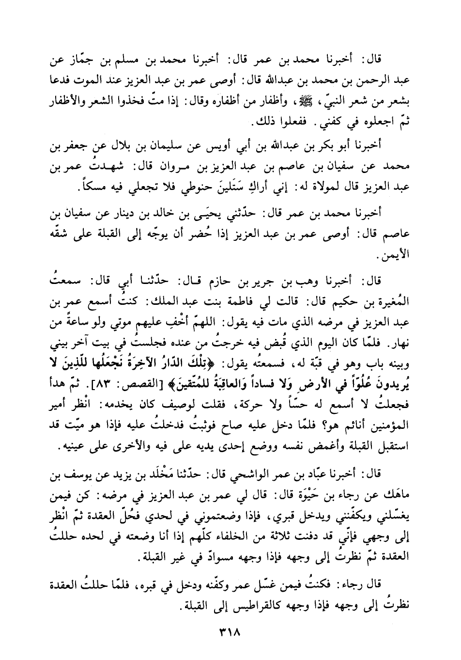 قَالَ: أَخْبَرَنَا وَهْبُ بْنُ جَرِيرِ بْنِ حَازِمٍ قَالَ: حَدَّثَنَا أَبِي قَالَ: سَمِعْتُ الْمُغِيرَةَ بْنَ حَكِيمٍ قَالَ: قَالَتْ لِي فَاطِمَةُ بِنْتُ عَبْدِ الْمَلِكِ: كُنْتُ أَسْمَعُ عُمَرَ بْنَ عَبْدِ الْعَزِيزِ فِي مَرَضِهِ الَّذِي مَاتَ فِيهِ يَقُولُ: اللَّهُمَّ أَخْفِ عَلَيْهِمْ مَوْتِي وَلَوْ سَاعَةً مِنْ نَهَارٍ. فَلَمَّا كَانَ الْيَوْمُ الَّذِي قُبِضَ فِيهِ خَرَجْتُ مِنْ عِنْدِهِ فَجَلَسْتُ فِي بَيْتٍ آخَرَ بَيْنِي وَبَيْنَهُ بَابٌ وَهُوَ فِي قُبَّةٍ لَهُ. فَسَمِعْتُهُ يَقُولُ: «تِلْكَ الدَّارُ الْآخِرَةُ نَجْعَلُها لِلَّذِينَ لا يُرِيدُونَ عُلُوًّا فِي الْأَرْضِ وَلا فَساداً وَالْعاقِبَةُ لِلْمُتَّقِينَ» القصص: 83. ثُمَّ هَدَأَ فَجَعَلْتُ لا أَسْمَعُ لَهُ حِسًّا وَلا حَرَكَةً. فَقُلْتُ لِوَصِيفٍ كَانَ يَخْدُمُهُ: انْظُرْ أَمِيرَ الْمُؤْمِنِينَ أَنَائِمٌ هُوَ؟ فَلَمَّا دَخَلَ عَلَيْهِ صَاحَ فَوَثَبْتُ فَدَخَلْتُ عَلَيْهِ فَإِذَا هُوَ مَيِّتٌ قَدِ اسْتَقْبَلَ الْقِبْلَةَ وَأَغْمَضَ نَفْسَهُ وَوَضَعَ إِحْدَى يَدَيْهِ عَلَى فِيهِ وَالأُخْرَى عَلَى عَيْنَيْهِ.