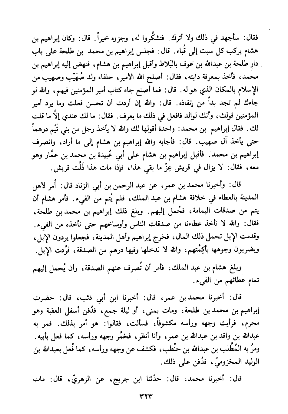 قَالَ: وَأَخْبَرَنَا مُحَمَّدُ بْنُ عُمَرَ. عَنْ عَبْدِ الرَّحْمَنِ بْنِ أبي الزناد قَالَ: أُمِرَ لأَهْلِ الْمَدِينَةِ بِالْعَطَاءِ فِي خِلافَةِ هِشَامِ بْنِ عَبْدِ الْمَلِكِ. فَلَمْ يُتِمَّ مِنَ الْفَيْءِ. فَأَمَرَ هِشَامٌ أَنْ يُتِمَّ مِنْ صَدَقَاتِ الْيَمَامَةِ. فَحَمَلَ إِلَيْهِمْ. وَبَلَغَ ذَلِكَ إِبْرَاهِيمَ بْنَ مُحَمَّدِ بْنِ طَلْحَةَ.