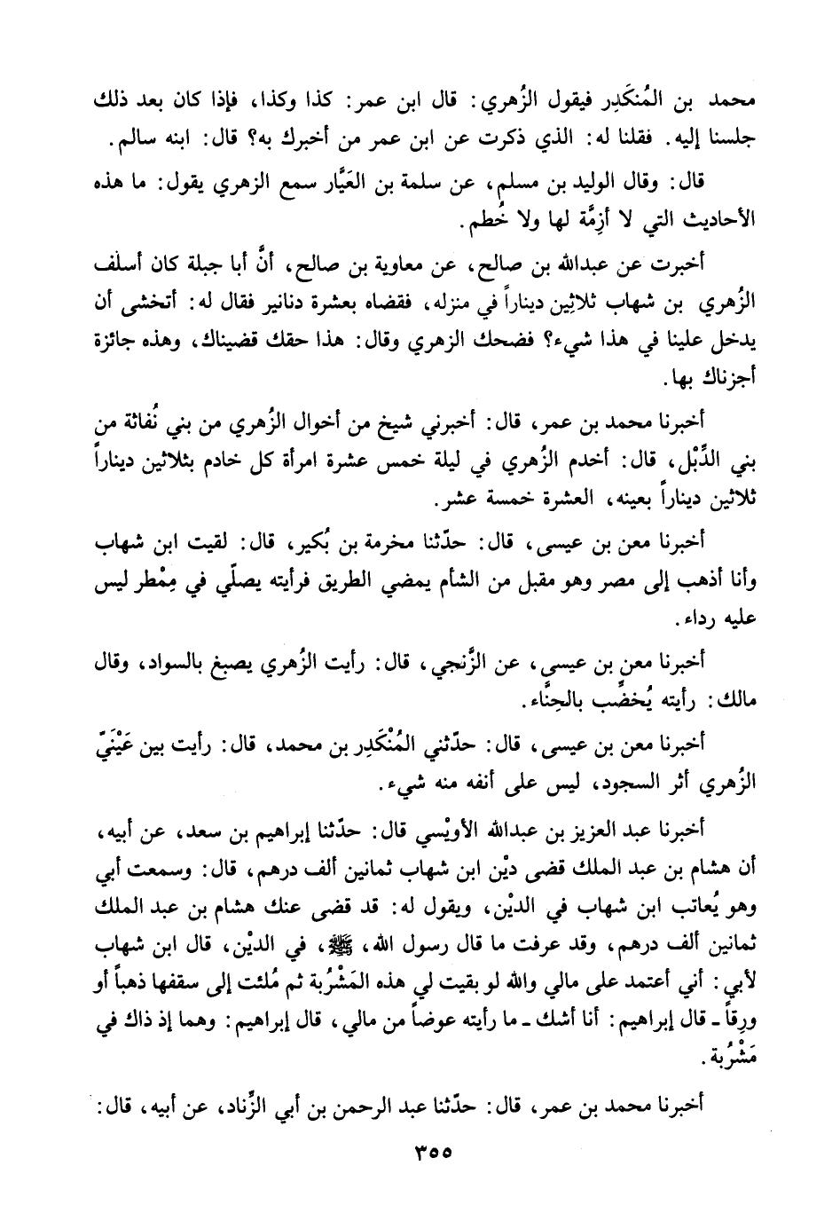 أَنَّ هِشَامَ بْنَ عَبْدِ الْمَلِكِ قَضَى دَيْنَ ابْنِ شِهَابٍ ثَمَانِينَ أَلْفَ دِرْهَمٍ. قَالَ: وَسَمِعْتُ أَبِيَ وَهُوَ يُعَاتِبُ ابْنَ شِهَابٍ فِي الدَّيْنِ. وَيَقُولُ لَهُ: قَدْ قَضَى عَنْكَ هِشَامُ بْنُ عَبْدِ الْمَلِكِ ثَمَانِينَ أَلْفَ دِرْهَمٍ. وَقَدْ عَرَفْتَ مَا قَالَ رَسُولُ اللَّهِ - صَلَّى اللَّهُ عَلَيْهِ وَسَلَّمَ - فِي الدَّيْنِ. قَالَ ابْنُ شِهَابٍ لأَبِي: إِنِّي أَعْتَمِدُ عَلَى مَالِي وَاللَّهِ لَوْ بَقِيَتْ لِي هَذِهِ الْمَشْرُبَةُ ثُمَّ مُلِئَتْ إِلَيَّ سُقُفُهَا ذَهَبًا أَوْ وَرِقًا- قَالَ إِبْرَاهِيمُ: أَنَا أَشُكُّ- مَا رَأَيْتُهُ عِوَضًا مِنْ مَالِي. قَالَ إِبْرَاهِيمُ: وَهُمَا إِذْ ذَاكَ فِي مَشْرُبَةٍ.