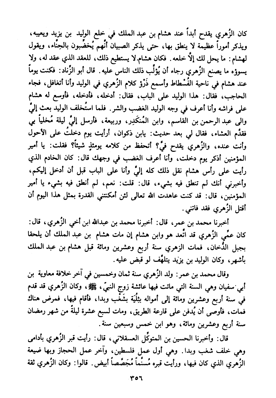 وَأَخْبَرَنِي أَنَّكَ لَمْ تَنْطِقْ فِيهِ بِشَيْءٍ. قَالَ: قُلْتُ: نَعَمْ. لَمْ أَنْطِقْ فِيهِ بِشَيْءٍ يَا أَمِيرَ الْمُؤْمِنِينَ. قَالَ: قَدْ كُنْتُ عَاهَدْتُ اللَّهَ تَعَالَى لَئِنْ أَمْكَنَتْنِي الْقُدْرَةُ بِمِثْلِ هَذَا الْيَوْمِ أَنْ أَقْتُلَ الزُّهْرِيَّ فَقَدْ فَاتَنِي.