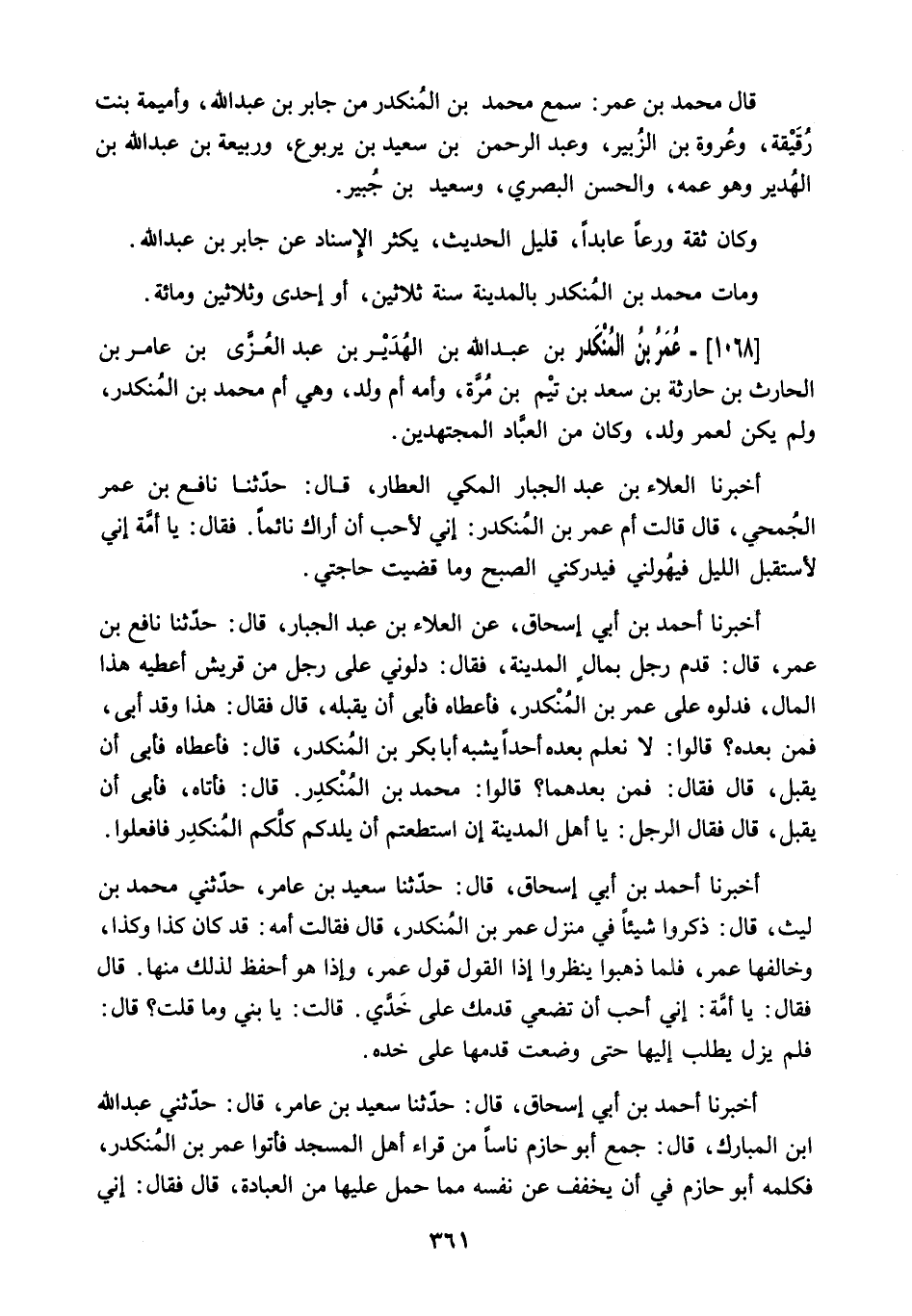 أَخْبَرَنَا الْعَلاءُ بْنُ عَبْدِ الْجَبَّارِ الْمَكِّيُّ الْعَطَّارُ. قَالَ: حَدَّثَنَا نَافِعُ بْنُ عُمَرَ الْجُمَحِيُّ. قَالَ قَالَتْ أم عُمَرَ بْنِ الْمُنْكَدِرِ: إِنِّي لأَحِبُّ أَنْ أَرَاكَ نَائِمًا. فَقَالَ: يَا أُمَّهْ إِنِّي لأَسْتَقْبِلُ اللَّيْلَ فَيَهُولُنِي فَيُدْرِكُنِي الصُّبْحُ وَمَا قَضَيْتُ حَاجَتِي.