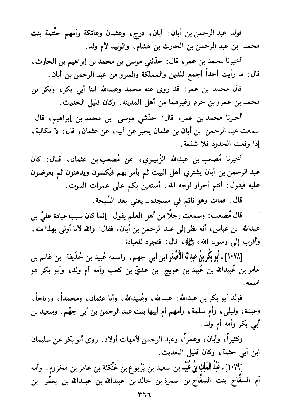 أَخْبَرَنَا مُصْعَبُ بْنُ عَبْدِ اللَّهِ الزُّبَيْرِيُّ. عَنْ مُصْعَبِ بْنِ عُثْمَانَ. قَالَ: كَانَ عَبْدُ الرَّحْمَنِ بْنُ أَبَانَ يَشْتَرِي أَهْلَ الْبَيْتِ ثُمَّ يَأْمُرُ بِهِمْ فَيُكْسَوْنَ وَيَدَّهِنُونَ ثُمَّ يُعْرَضُونَ عَلَيْهِ فَيَقُولُ: أَنْتُمْ أَحْرَارٌ لِوَجْهِ اللَّهِ. أَسْتَعِينُ بِكُمْ عَلَى غَمَرَاتِ الْمَوْتِ.