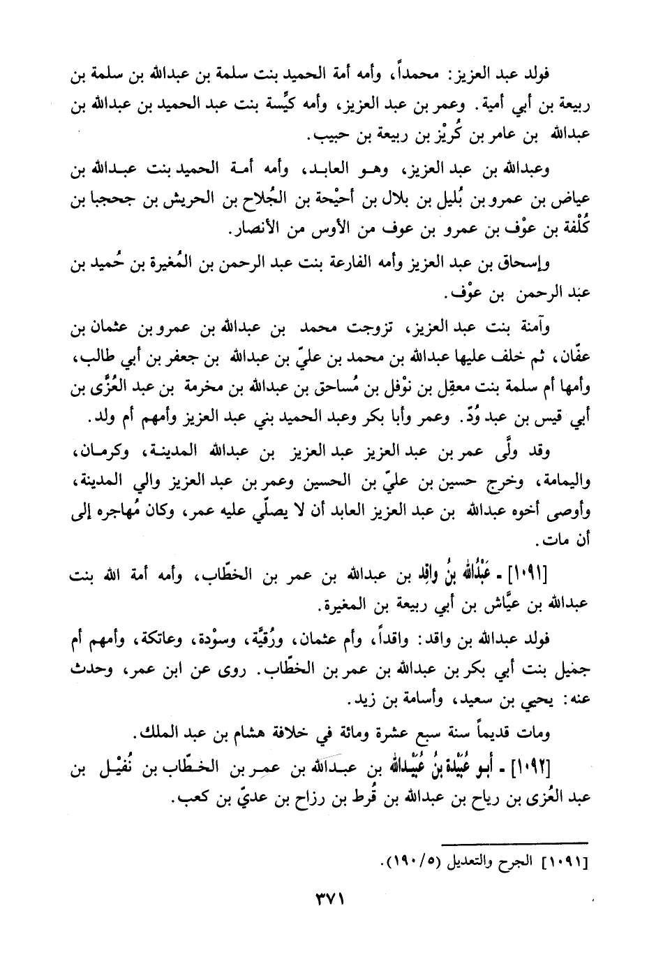 وعبد الله بن عبد العزيز. وهو العابد. وأمه أمة الحميد بنت عبد الله بن عياض بن عمرو بن بليل بن بلال بن أُحَيْحَةُ بْنِ الْجُلاحِ بْنِ الْحَرِيشِ بْنِ جَحْجَبَا بْنِ كُلْفَةَ بْنِ عَوْفِ بْنِ عَمْرِو بْنِ عوف من الأوس من الأنصار.