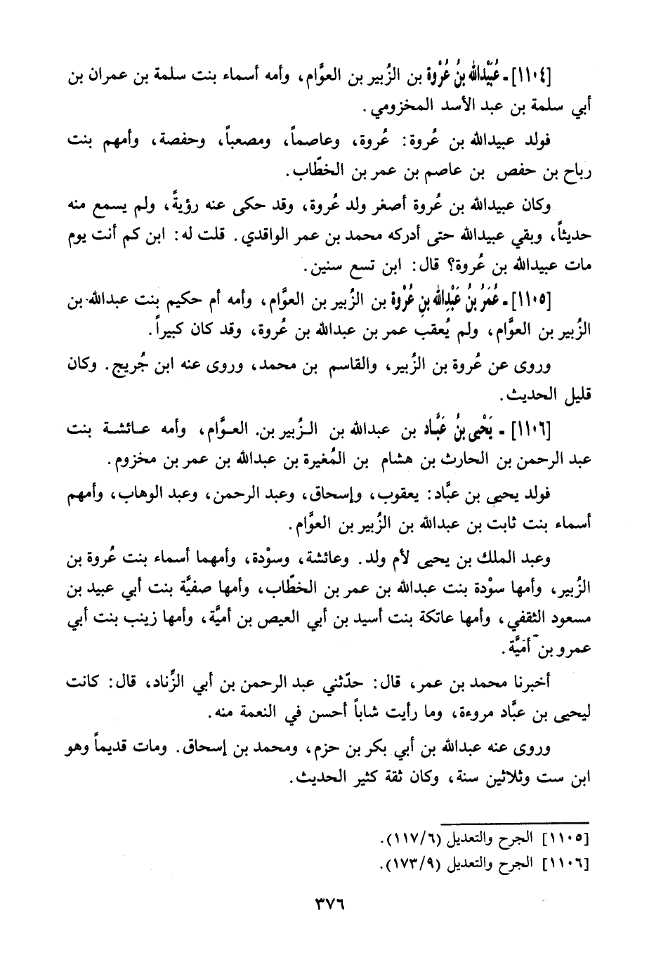 بن الزبير بن العوام. وأمه أم حكيم بنت عبد الله بن الزبير بن العوام. ولم يعقب عمر بن عبد الله بن عروة. وقد كان كبيرا.