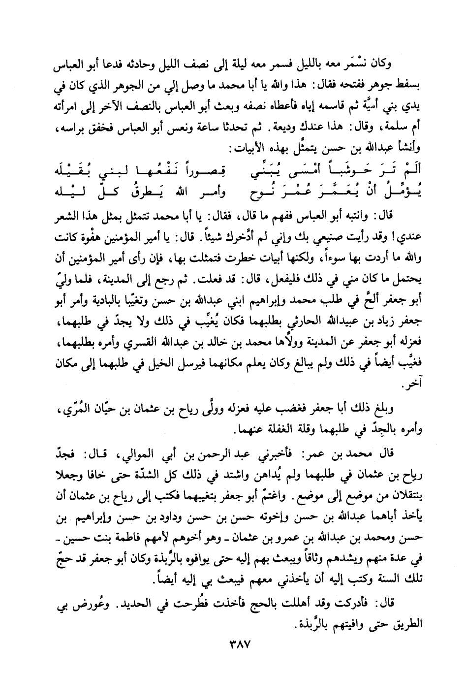 قَالَ: وَانْتَبَهَ أَبُو الْعَبَّاسِ فَفَهِمَ مَا قَالَ. فَقَالَ: يَا أَبَا مُحَمَّدٍ تَتَمَثَّلُ بِمِثْلِ هَذَا الشِّعْرِ عِنْدِي! وَقَدْ رَأَيْتَ صَنِيعِي بِكَ وَإِنِّي لَمْ أَدَّخِرْكَ شَيْئًا. قَالَ: يَا أَمِيرَ الْمُؤْمِنِينَ هَفْوَةٌ كَانَتْ وَاللَّهِ مَا أَرَدْتُ بِهَا سُوءًا. وَلَكِنَّهَا أَبْيَاتٌ خَطَرَتْ فَتَمَثَّلْتُ بِهَا. فَإِنْ رَأَى أَمِيرُ الْمُؤْمِنِينَ أَنْ يَحْتَمِلَ مَا كَانَ مِنِّي فِي ذَلِكَ فَلْيَفْعَلْ. قَالَ: قَدْ فَعَلْتُ. ثُمَّ رَجَعَ إِلَى الْمَدِينَةِ. فَلَمَّا وَلِيَ أَبُو جَعْفَرٍ أَلَحَّ فِي طَلَبِ مُحَمَّدٍ وَإِبْرَاهِيمَ ابْنَيْ عَبْدِ اللَّهِ بْنِ حَسَنٍ وَتَغَيَّبَا بِالْبَادِيَةِ وَأَمَرَ أَبُو جَعْفَرٍ زِيَادَ بْنَ عُبَيْدِ اللَّهِ الْحَارِثِيَّ بِطَلَبِهِمَا فَكَانَ يُغَيِّبُ فِي ذَلِكَ وَلا يَجِدُّ فِي طَلَبِهِمَا.