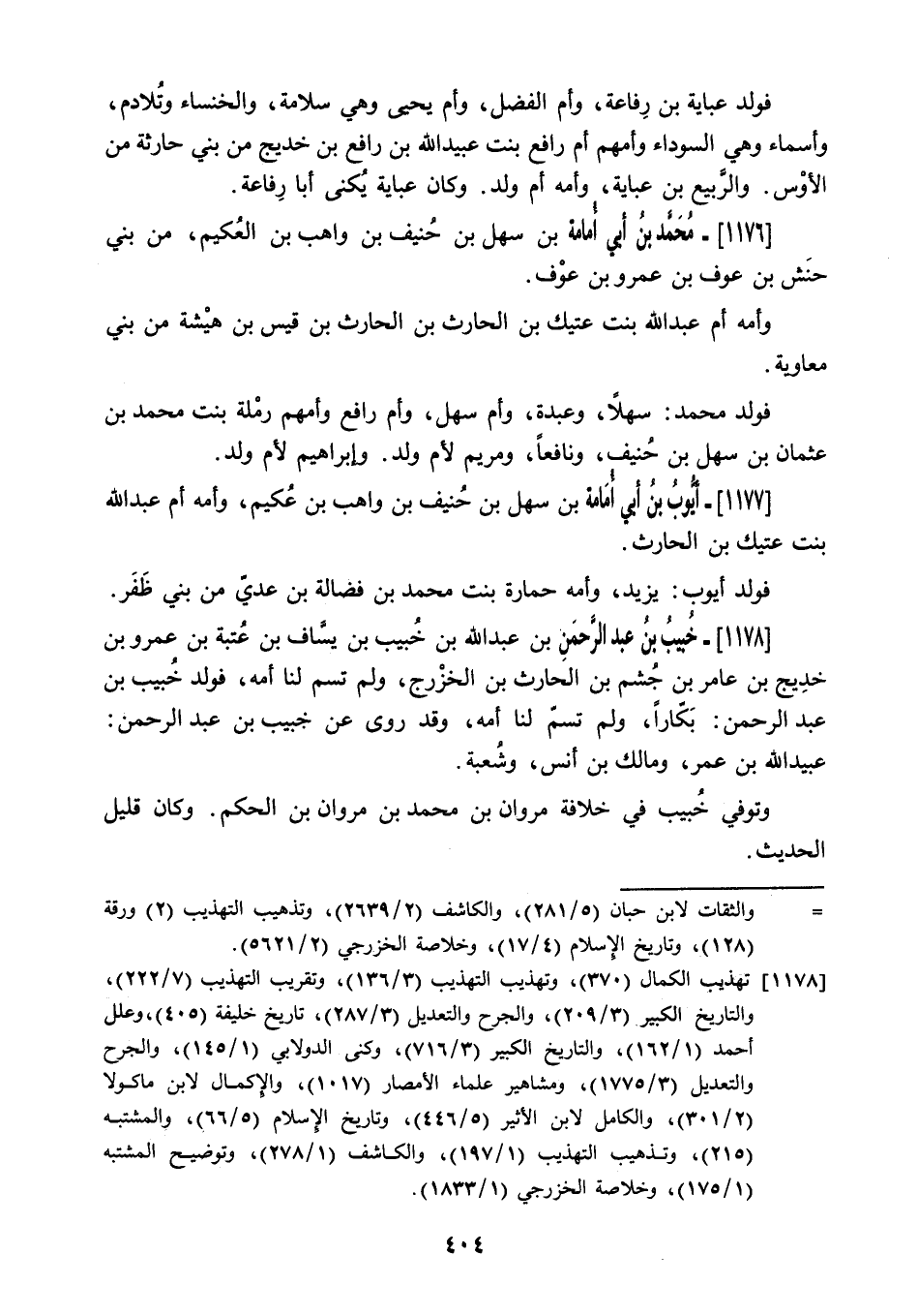 1178 تهذيب الكمال (370) ، وتهذيب التهذيب (3/ 136) ، وتقريب التهذيب (7/ 222) ، والتاريخ الكبير (3/ 209) ، والجرح والتعديل (3/ 287) ، تاريخ خليفة (405) ، وعلل أحمد (1/ 162) ، والتاريخ الكبير (3/ 716) ، وكنى الدولابي (1/ 145) ، والجرح والتعديل (3/ 1775) ، ومشاهير علماء الأمصار (1017) ، والإكمال لابن ماكمولا (2/ 301) ، والكامل لابن الأثير (5/ 446) ، وتاريخ الإسلام (5/ 66) ، والمشتبه (215) ، وتذهيب التهذيب (1/ 197) ، والكاشف (1/ 278) ، وتوضيح المشتبه (1/ 175) ، وخلاصة الخزرجي (1/ 1833) .