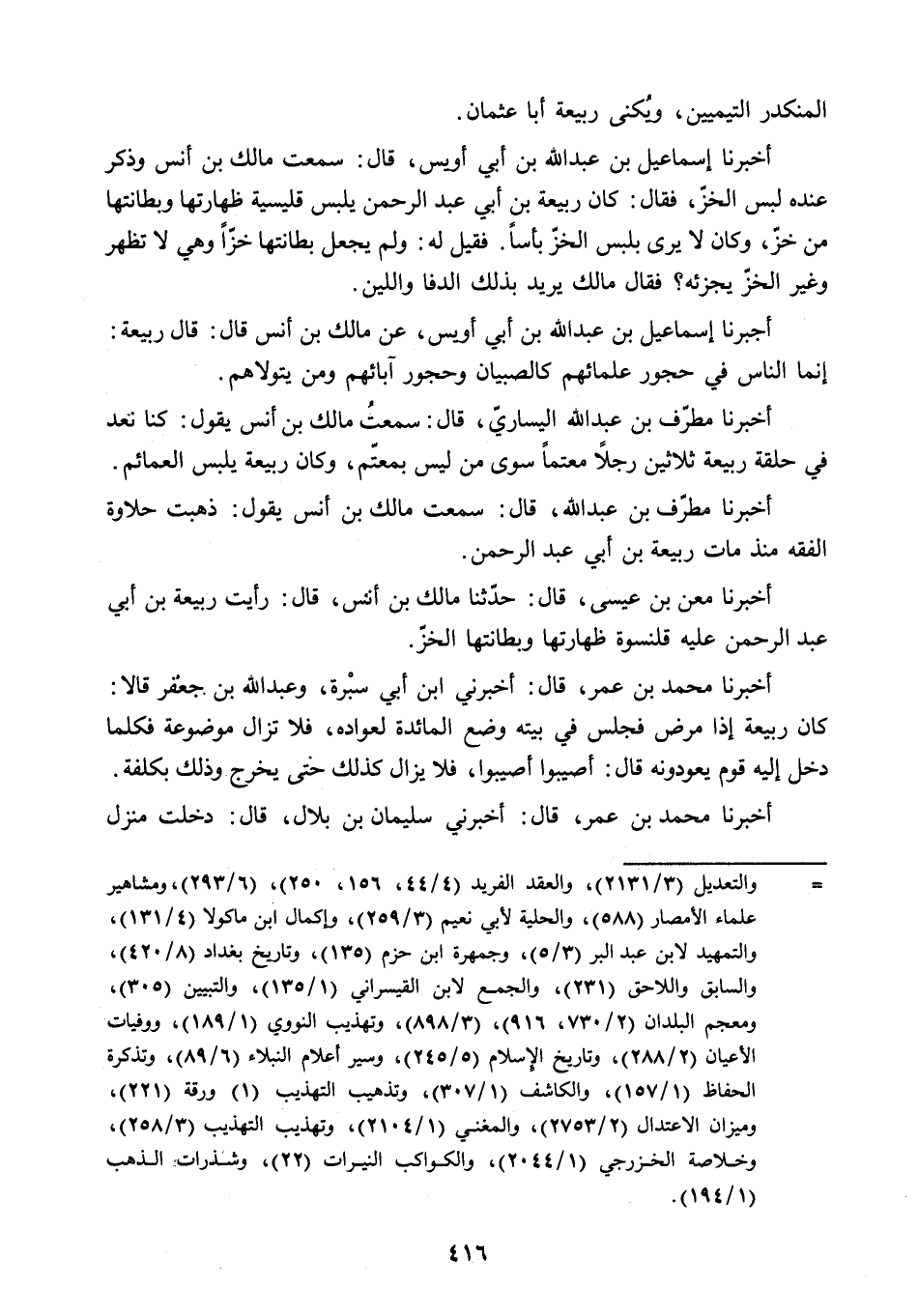 أَخْبَرَنَا مُطَرِّفُ بْنُ عَبْدِ اللَّهِ الْيَسَارِيُّ. قَالَ: سَمِعْتُ مَالِكَ بْنَ أَنَسٍ يَقُولُ: كُنَّا نَعُدُّ فِي حَلْقَةِ رَبِيعَةَ ثَلاثِينَ رَجُلا مُعْتَمًّا سِوَى مَنْ لَيْسَ بِمُعْتَمٍّ. وَكَانَ رَبِيعَةُ يَلْبَسُ الْعَمَائِمَ.