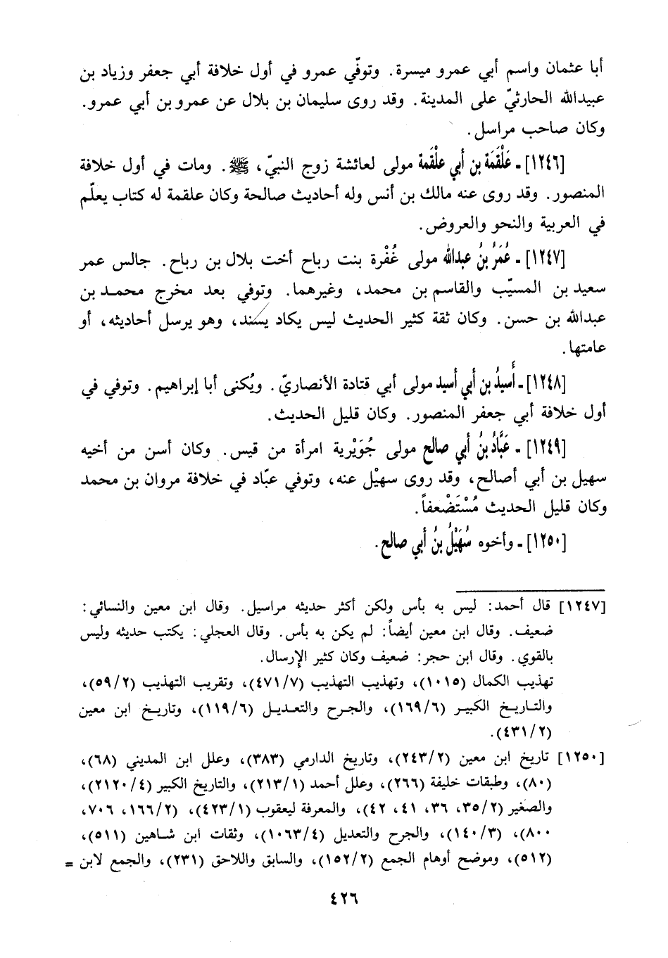 1250 تاريخ ابن معين (2/ 243) ، وتاريخ الدارمي (383) ، وعلل ابن المديني (68) ، (80) ، وطبقات خليفة (266) ، وعلل أحمد (1/ 213) ، والتاريخ الكبير (4/ 2120) ، والصغير (2/ 35، 36، 41، 42) ، والمعرفة ليعقوب (1/ 423) ، (2/ 166، 706، 800) ، (3/ 140) ، والجرح والتعديل (4/ 1063) ، وثقات ابن شاهين (511) ، (512) ، وموضح أوهام الجمع (2/ 152) ، والسابق واللاحق (231) ، والجمع لابن القيسراني (1/ 207) ، وتاريخ الإسلام (5/ 261) ، وسير أعلام النبلاء (5/ 458) ، والمغني (1/ 2690، 2691) ، وتذكرة الحفاظ (1/ 137) ، والعبر (1/ 273، 296، 302) ، وتذهيب التهذيب (2) ورقة (62) ، وميزان الاعتدال (2/ 3604) ، وشرح علل الترمذي لابن رجب (421) ، وتهذيب الكمال (2629) ، وتهذيب التهذيب (4/ 263) ، وتقرب التهذيب (1/ 338) ، وشذرات الذهب (1/ 208) ، وخلاصة الخزرجي (1/ 2813) .