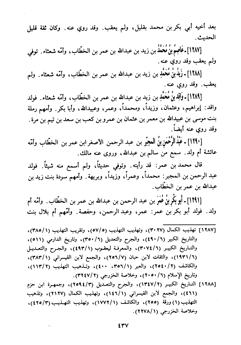 1288 التاريخ الكبير (2/ 1347) ، والجرح والتعديل (3/ 2594) ، وجمهرة ابن حزم (461) ، والجمع لابن القيسراني (1/ 146) ، وتهذيب الكمال (2127) ، وتذهيب التهذيب (1) ورقة (255) ، والكاشف (1/ 1772) ، وتهذيب التهذيب (3/ 425) ، وخلاصة الخزرجي (1/ 2278) .