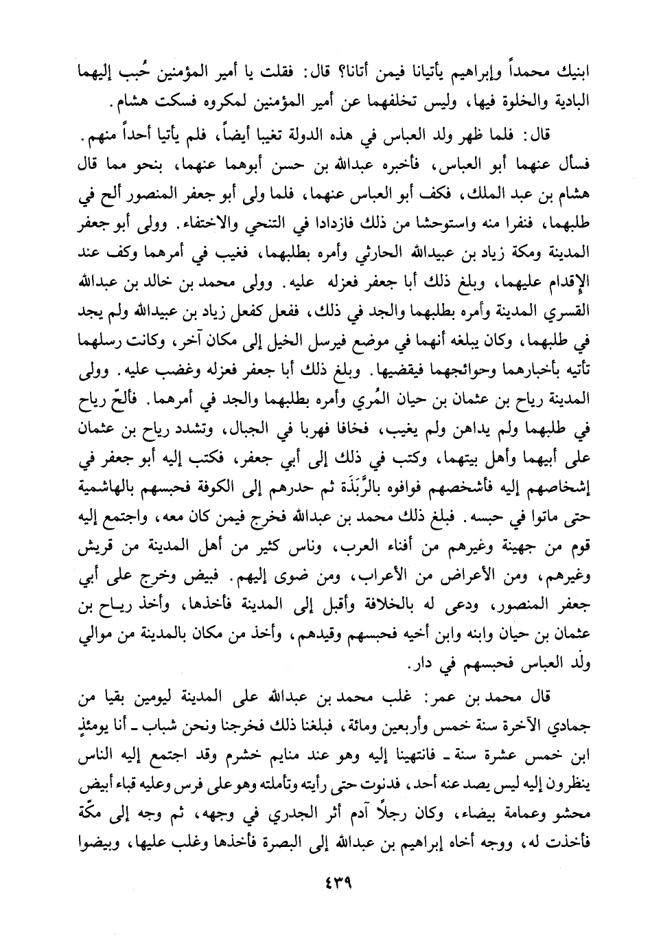 فَسَأَلَ عَنْهُمَا أَبُو الْعَبَّاسِ. فَأَخْبَرَهُ عَبْدُ اللَّهِ بْنُ حَسَنٍ أَبُوهُمَا عَنْهُمَا. بنحو مما قال هشام بْنِ عَبْدِ الْمَلِكِ. فَكَفَّ أَبُو الْعَبَّاسِ عَنْهُمَا. فَلَمَّا وَلِيَ أَبُو جَعْفَرٍ الْمَنْصُورُ أَلَحَّ فِي طَلَبِهِمَا. فَنَفَرَا مِنْهُ وَاسْتَوْحَشَا مِنْ ذَلِكَ فَازْدَادَا فِي التَّنَحِّي وَالاخْتِفَاءِ. وَوَلَّى أَبُو جَعْفَرٍ الْمَدِينَةَ وَمَكَّةَ زِيَادَ بْنَ عُبَيْدِ اللَّهِ الْحَارِثِيَّ وَأَمَرَهُ بطلبهما. فغيب في أمرهما وكف عند الإِقْدَامِ عَلَيْهِمَا. وَبَلَغَ ذَلِكَ أَبَا جَعْفَرٍ فَعَزَلَهُ عَلَيْهِ. وَوَلَّى مُحَمَّدَ بْنَ خَالِدِ بْنِ عَبْدِ اللَّهِ الْقَسْرِيَّ الْمَدِينَةَ وَأَمَرَهُ بِطَلَبِهِمَا وَالْجِدِّ فِي ذَلِكَ. فَفَعَلَ كَفِعْلِ زِيَادِ بْنِ عُبَيْدِ اللَّهِ وَلَمْ يَجِدَّ فِي طَلَبِهِمَا. وَكَانَ يَبْلُغُهُ أَنَّهُمَا فِي مَوْضِعٍ فَيُرْسِلُ الْخَيْلَ إِلَى مَكَانٍ آخَرَ. وَكَانَتْ رُسُلُهُمَا تَأْتِيهِ بِأَخْبَارِهِمَا وَحَوَائِجِهِمَا فَيَقْضِيهَا. وَبَلَغَ ذَلِكَ أَبَا جَعْفَرٍ فَعَزَلَهُ وَغَضِبَ عَلَيْهِ. وَوَلَّى الْمَدِينَةَ رِيَاحَ بْنَ عُثْمَانَ بْنِ حَيَّانَ الْمُرِّيَّ وأمره بطلبهما والجد في أَمْرِهِمَا. فَأَلَحَّ رِيَاحٌ فِي طَلَبِهِمَا وَلَمْ يُدَاهِنْ وَلَمْ يُغَيِّبْ. فَخَافَا فَهَرِبَا فِي الْجِبَالِ. وَتَشَدَّدَ رِيَاحُ بْنُ عُثْمَانَ عَلَى أَبِيهِمَا وَأَهْلِ بَيْتِهِمَا. وَكَتَبَ فِي ذَلِكَ إِلَى أَبِي جَعْفَرٍ. فَكَتَبَ إِلَيْهِ أَبُو جَعْفَرٍ فِي إِشْخَاصِهِمْ إِلَيْهِ فَأَشْخَصَهُمْ فَوَافَوْهُ بِالرَّبَذَةِ ثُمَّ حَدَرَهُمْ إِلَى الْكُوفَةِ فَحَبَسَهُمْ بِالْهَاشِمِيَّةِ حَتَّى مَاتُوا فِي حَبْسِهِ. فَبَلَغَ ذَلِكَ مُحَمَّدَ بْنَ عَبْدِ اللَّهِ فَخَرَجَ فِيمَنْ كَانَ مَعَهُ. وَاجْتَمَعَ إِلَيْهِ قَوْمٌ مِنْ جُهَيْنَةَ وَغَيْرِهِمْ مِنْ أَفْنَاءِ الْعَرَبِ. وَنَاسٌ كَثِيرٌ مِنْ أَهْلِ الْمَدِينَةِ مِنْ قُرَيْشٍ وَغَيْرِهِمْ. وَمِنَ الأَعْرَاضِ مِنَ الأَعْرَابِ. وَمِنْ ضَوَى إِلَيْهِمْ. فَبَيَّضَ وَخَرَجَ عَلَى أَبِي جَعْفَرٍ الْمَنْصُورِ. وَدَعَى لَهُ بِالْخِلافَةِ وَأَقْبَلَ إِلَى الْمَدِينَةِ فَأَخَذَهَا. وَأَخَذَ رِيَاحَ بْنَ عُثْمَانَ بْنِ حَيَّانَ وَابْنَهُ وَابْنَ أَخِيهِ فَحَبَسَهُمْ وَقَيَّدَهُمْ. وأخذ من مكان بالمدينة من موالي وَلَدِ الْعَبَّاسِ فَحَبَسَهُمْ فِي دَارٍ.