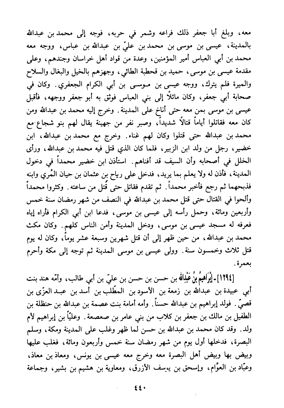 مَعَهُ. وَبَلَغَ أَبَا جَعْفَرٍ ذَلِكَ فَرَاعَهُ وَشَمَّرَ فِي حَرْبِهِ. فَوَجَّهَ إِلَى مُحَمَّدِ بْنِ عَبْدِ اللَّهِ بِالْمَدِينَةِ. عِيسَى بْنَ مُوسَى بْنِ مُحَمَّدِ بْنِ عَلِيٍّ بن عبد الله بن عباس. وَوَجَّهَ مَعَهُ مُحَمَّدَ بْنَ أَبِي الْعَبَّاسِ أَمِيرَ الْمُؤْمِنِينَ. وَعِدَّةً مِنْ قُوَّادِ أَهْلِ خُرَاسَانَ وَجُنْدِهِمْ. وَعَلَى مُقَدِّمَةِ عِيسَى بْنِ مُوسَى. حُمَيْدُ بْنُ قَحْطَبَةَ الطَّائِيُّ. وَجَهَّزَهُمْ بِالْخَيْلِ وَالْبِغَالِ وَالسِّلاحِ وَالْمِيَرَةِ فَلَمْ يَتْرُكْ. وَوَجَّهَ عِيسَى بْنَ مُوسَى بْنِ أَبِي الْكِرَامِ الْجَعْفَرِيَّ. وَكَانَ فِي صَحَابَةِ أَبِي جَعْفَرٍ. وَكَانَ مَائِلا إِلَى بَنِي الْعَبَّاسِ فَوَثِقَ بِهِ أَبُو جَعْفَرٍ وَوَجَّهَهُ. فَأَقْبَلَ عِيسَى بْنُ مُوسَى بِمَنْ مَعَهُ حَتَّى أَنَاخَ عَلَى الْمَدِينَةِ. وَخَرَجَ إِلَيْهِ مُحَمَّدُ بْنُ عَبْدِ اللَّهِ وَمَنْ كَانَ مَعَهُ فَقَاتَلُوا أَيَّامًا قِتَالا شَدِيدًا. وَصُبِرَ نَفَرٌ مِنْ جُهَيْنَةَ يُقَالُ لَهُمْ بَنُو شُجَاعٍ مَعَ مُحَمَّدِ بْنِ عَبْدِ اللَّهِ حَتَّى قُتِلُوا وَكَانَ لَهُمْ غِنَاءٌ. وَخَرَجَ مَعَ مُحَمَّدِ بْنِ عَبْدِ اللَّهِ. ابنُ خُضَيْرٍ. رَجُلٌ مِنْ وَلَدِ ابْنِ الزُّبَيْرِ. فَلَمَّا كَانَ الَّذِي قُتِلَ فِيهِ مُحَمَّدُ بْنُ عَبْدِ اللَّهِ. وَرَأَى الْخَلَلَ فِي أَصْحَابِهِ وَأَنَّ السَّيْفَ قَدْ أَفْنَاهُمْ. اسْتَأْذَنَ ابْنَ خضير محمدا فِي دُخُولِ الْمَدِينَةِ. فَأَذِنَ لَهُ وَلا يَعْلَمُ بما يريد. فدخل على رياح بن عُثْمَانُ بْنُ حَيَّانَ الْمُرِّيُّ وَابْنُهُ فَذَبَحَهُمَا ثُمَّ رَجَعَ فَأَخْبَرَ مُحَمَّدًا. ثُمَّ تَقَدَّمَ فَقَاتَلَ حَتَّى قُتِلَ مِنْ سَاعَتِهِ. وَكَثَّرُوا مُحَمَّدًا وَأَلَحُّوا فِي الْقِتَالِ حَتَّى قُتِلَ مُحَمَّدُ بْنُ عَبْدِ اللَّهِ فِي النِّصْفِ مِنْ شَهْرِ رَمَضَانَ سَنَةَ خَمْسٍ وَأَرْبَعِينَ وَمِائَةٍ. وَحُمِلَ رَأْسُهُ إِلَى عِيسَى بْنِ مُوسَى. فَدَعَا ابْنَ أَبِي الْكِرَامِ فَأَرَاهُ إِيَّاهُ فَعَرَّفَهُ لَهُ مَسْجِدُ عِيسَى بْنِ مُوسَى. وَدَخَلَ الْمَدِينَةَ وَأَمِنَ النَّاسُ كُلُّهُمْ. وَكَانَ مَكَثَ مُحَمَّدُ بْنُ عَبْدِ اللَّهِ. مِنْ حِينَ ظَهَرَ إِلَى أَنْ قُتِلَ شَهْرَيْنِ وَسَبْعَةَ عَشَرَ يَوْمًا. وَكَانَ لَهُ يَوْمَ قُتِلَ ثَلاثٌ وَخَمْسُونَ سَنَةً. وَوَلَّى عِيسَى بْنُ مُوسَى الْمَدِينَةَ ثُمَّ تَوَجَّهَ إِلَى مَكَّةَ وَأَحْرَمَ بِعُمْرَةٍ.