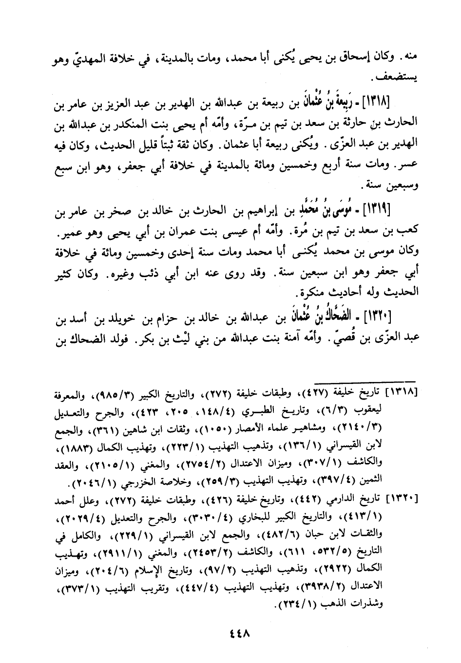 1320 تاريخ الدارمي (442) ، وتاريخ خليفة (426) ، وطبقات خليفة (272) ، وعلل أحمد (1/ 413) ، والتاريخ الكبير للبخاري (4/ 303) ، وو الجرح والتعديل ((4/ 2029) ، والثقات لابن حبان (6/ 482) ، والجمع لابن القيسراني (1/ 229) ، والكامل في التاريخ (5/ 532، 611) ، والكاشف (2/ 2453) ، والمغني (1/ 2911) ، وتهذيب الكمال (2922) ، وتذهيب التهذيب (2/ 97) ، وتاريخ الإسلام (6/ 204) ، وميزان الاعتدال (2/ 3938) ، وتهذيب التهذيب (4/ 447) ، وتقريب التهذيب (1/ 383) ، وشذرات الذهب (1/ 234) .