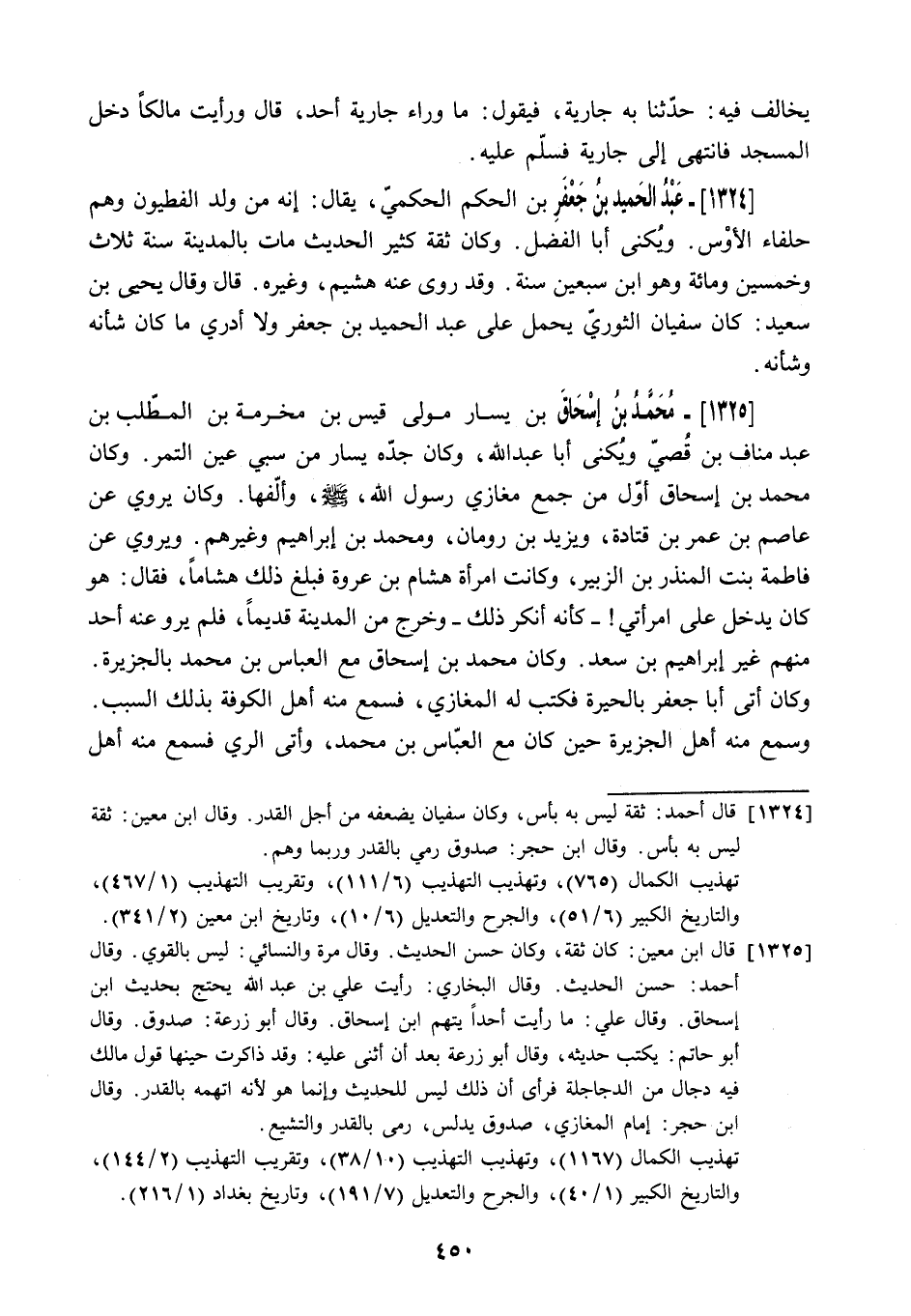 1325 قال ابن معين: كان ثقة، وكان حسن الحديث. وقال مرة والنسائي: ليس بالقوي. وقال أحمد: حسن الحديث. وقال البخاري: رأيت علي بن عبد الله يحتج بحديث ابن إسحاق. وقال علي: ما رأيت أحدا يتهم ابن إسحاق. وقال أبو زرعة: صدوق. وقال أبو حاتم: يكتب حديثه، وقال أبو زرعة بعد أن أثنى عليه: وقد ذاكرت حينها قول مالك فيه دجال من الدجاجلة فرأى أن ذلك ليس للحديث وإنما هو لأنه اتهمه بالقدر. وقال ابن حجر: إمام المغازي، صدوق يدلس، رمى بالقدر والتشيع.