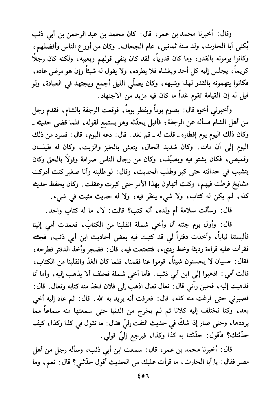 قَالَ: وأول يوم جئته أنا وأخي شملة انقلبنا من الكتاب. فعمدت أمي إلينا فألبستنا ثيابا. وأخذت دفترا لي قد كتبت فيه بعض أحاديث ابن أبي ذئب. فجئته فقرأت عليه قراءة رديئة وخط رديء. فتتعتعت فيه. قَالَ: فضجر وأخذ الدفتر فطرحه.