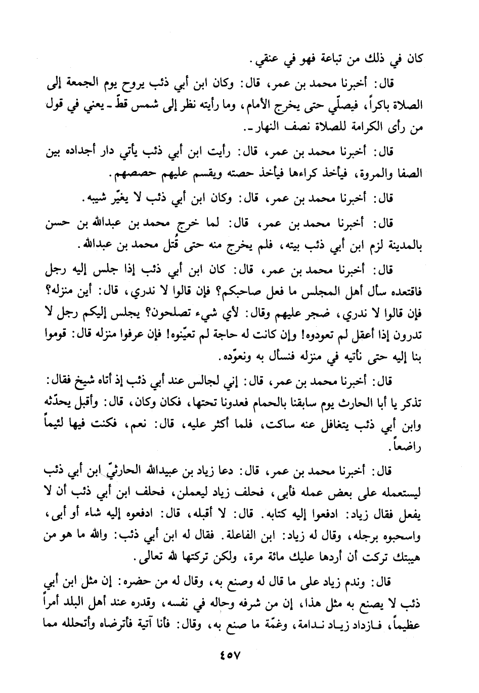 قَالَ: أَخْبَرَنَا مُحَمَّدُ بْنُ عُمَرَ. قَالَ: وَكَانَ ابن أبي ذئب يروح يوم الجمعة إلى الصلاة باكرا. فيصلي حتى يخرج الإمام. وما رأيته نظر إلى شمس قط- يعني في قول من رأى الكرامة للصلاة نصف النهار-.