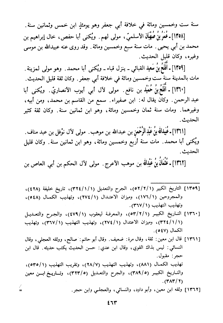 1360 التاريخ الكبير (1/ 2/ 53) ، والمعرفة ليعقوب (1/ 479) ، والجرح والتعديل (1/ 1/ 324) ، وميزان الاعتدال (1/ 274) ، وتهذيب التهذيب (1/ 367) ، وتهذيب الكمال (547) .