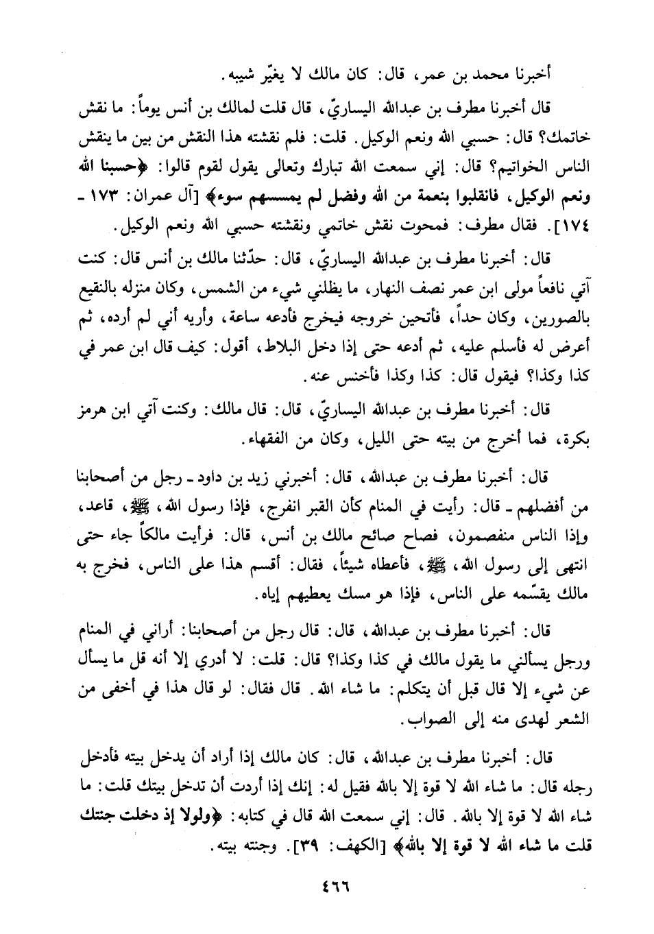 قَالَ أَخْبَرَنَا مُطَرِّفُ بْنُ عَبْدِ اللَّهِ الْيَسَارِيُّ. قَالَ قُلْتُ لِمَالِكِ بْنِ أَنَسٍ يَوْمًا: مَا نَقْشُ خَاتَمِكَ؟ قَالَ: حَسْبِيَ الله ونعم الوكيل. قلت: فلم نقشته هَذَا النَّقْشَ مِنْ بَيْنِ مَا يَنْقُشُ النَّاسُ الْخَوَاتِيمَ؟ قَالَ: إِنِّي سَمِعْتُ اللَّهَ تَبَارَكَ وَتَعَالَى يَقُولُ لِقَوْمٍ قَالُوا: «حَسْبُنَا اللَّهُ وَنِعْمَ الْوَكِيلُ. فَانْقَلَبُوا بِنِعْمَةٍ مِنَ اللَّهِ وَفَضْلٍ لَمْ يَمْسَسْهُمْ سُوءٌ» آل عمران: 173- 174. فقَالَ مُطَرِّفٌ: فَمَحَوْتُ نَقْشَ خَاتَمِي وَنَقَشْتُهُ حَسْبِيَ اللَّهُ وَنِعْمَ الْوَكِيلُ.