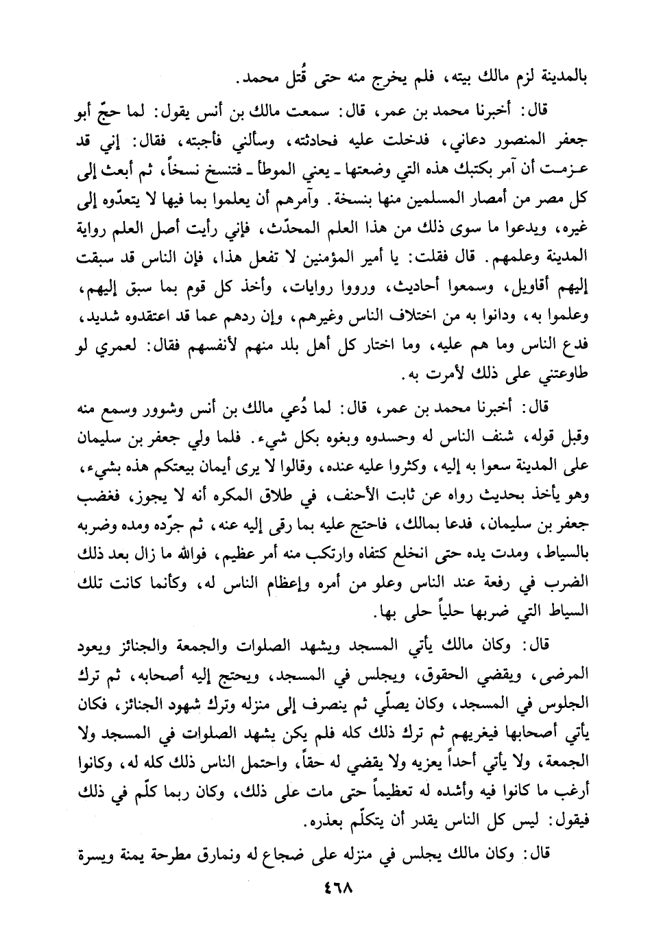 قَالَ: أَخْبَرَنَا مُحَمَّدُ بْنُ عُمَرَ. قَالَ: سَمِعْتُ مالك بن أنس يقول: لَمَّا حَجَّ أَبُو جَعْفَرٍ الْمَنْصُورُ دَعَانِي. فَدَخَلْتُ عَلَيْهِ فَحَادَثْتُهُ. وَسَأَلَنِي فَأَجَبْتُهُ. فَقَالَ: إِنِّي قَدْ عَزَمْتُ أَنْ آمُرَ بِكُتُبِكَ هَذِهِ الَّتِي وَضَعْتَهَا- يَعْنِي الْمُوَطَّأَ- فَتُنْسَخُ نُسَخًا. ثُمَّ أَبْعَثُ إِلَى كُلِّ مِصْرٍ مِنْ أَمْصَارِ الْمُسْلِمِينَ مِنْهَا بِنُسْخَةٍ. وَآمَرُهُمْ أَنْ يُعَلِّمُوا بِمَا فِيهَا لا يَتَعَدَّوْهُ إِلَى غَيْرِهِ. وَيَدَعُوا مَا سِوَى ذَلِكَ مِنْ هَذَا الْعِلْمِ الْمُحْدَثِ. فَإِنِّي رَأَيْتُ أَصْلَ الْعِلْمِ رِوَايَةَ الْمَدِينَةِ وَعِلْمِهِمْ. قَالَ فَقُلْتُ: يَا أَمِيرَ الْمُؤْمِنِينَ لا تَفْعَلْ هَذَا. فَإِنَّ النَّاسَ قَدْ سَبَقَتْ إِلَيْهِمْ أَقَاوِيلُ. وَسَمَعُوا أَحَادِيثَ. وَرَوَوْا رِوَايَاتٍ. وَأَخَذَ كُلُّ قَوْمٍ بِمَا سَبَقَ إِلَيْهِمْ.