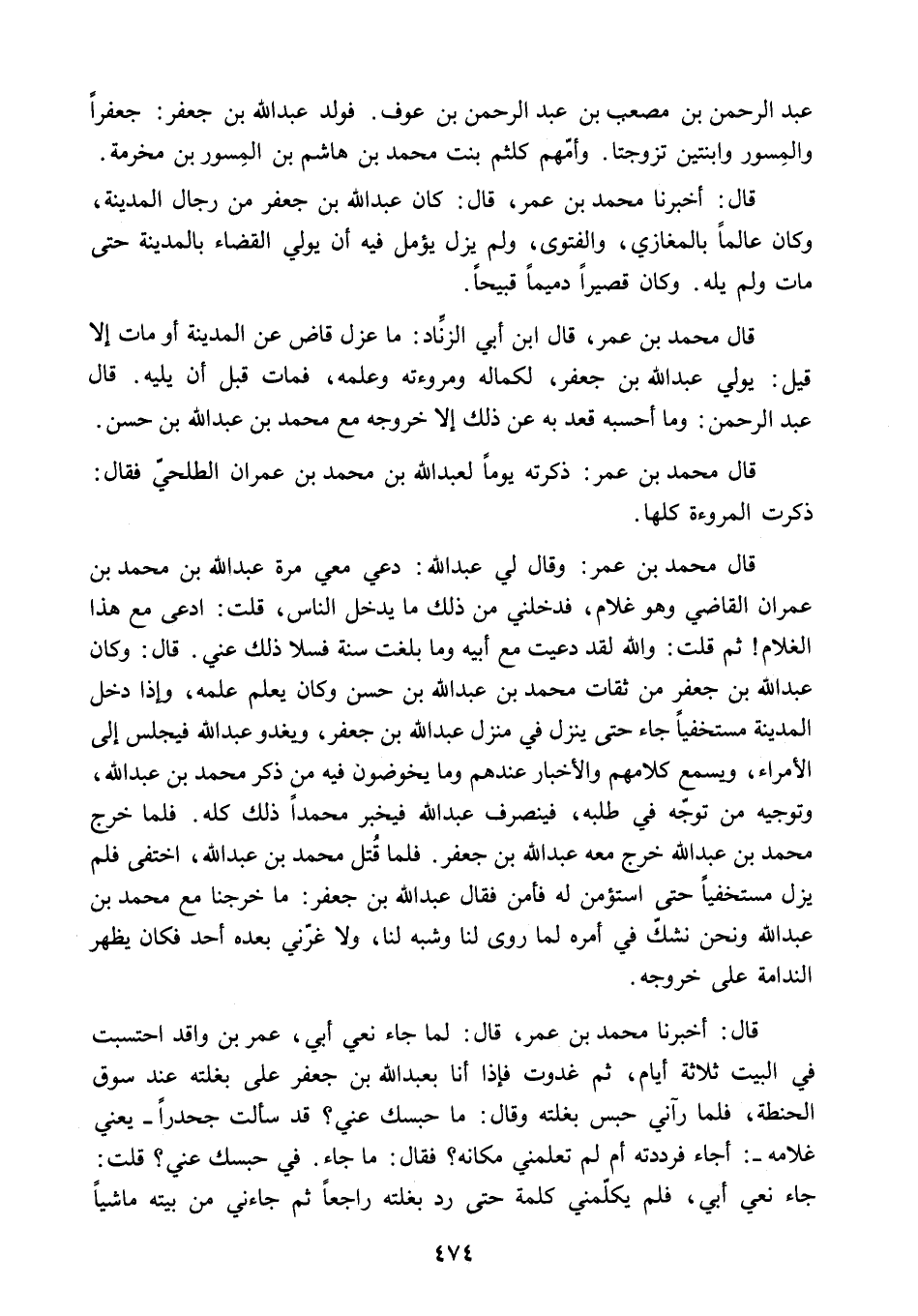 قَالَ محمد بن عمر: وقال لي عبد الله: دعي معي مرة عبد الله بن محمد بن عمران القاضي وهو غلام. فدخلني من ذلك ما يدخل الناس. قلت: ادعي مع هذا الغلام! ثم قلت: والله لقد دعيت مع أبيه وما بلغت سنة فسلا ذلك عني. قَالَ: وكان عبد الله بن جعفر من ثقات محمد بن عبد الله بن حسن وكان يعلم علمه. وإذا دخل المدينة مستخفيًا جاء حتى ينزل في منزل عبد الله بن جعفر. ويغدو عبد الله فيجلس إلى الأمراء. ويسمع كلامهم والأخبار عندهم وما يخوضون فيه من ذكر محمد بن عبد الله.