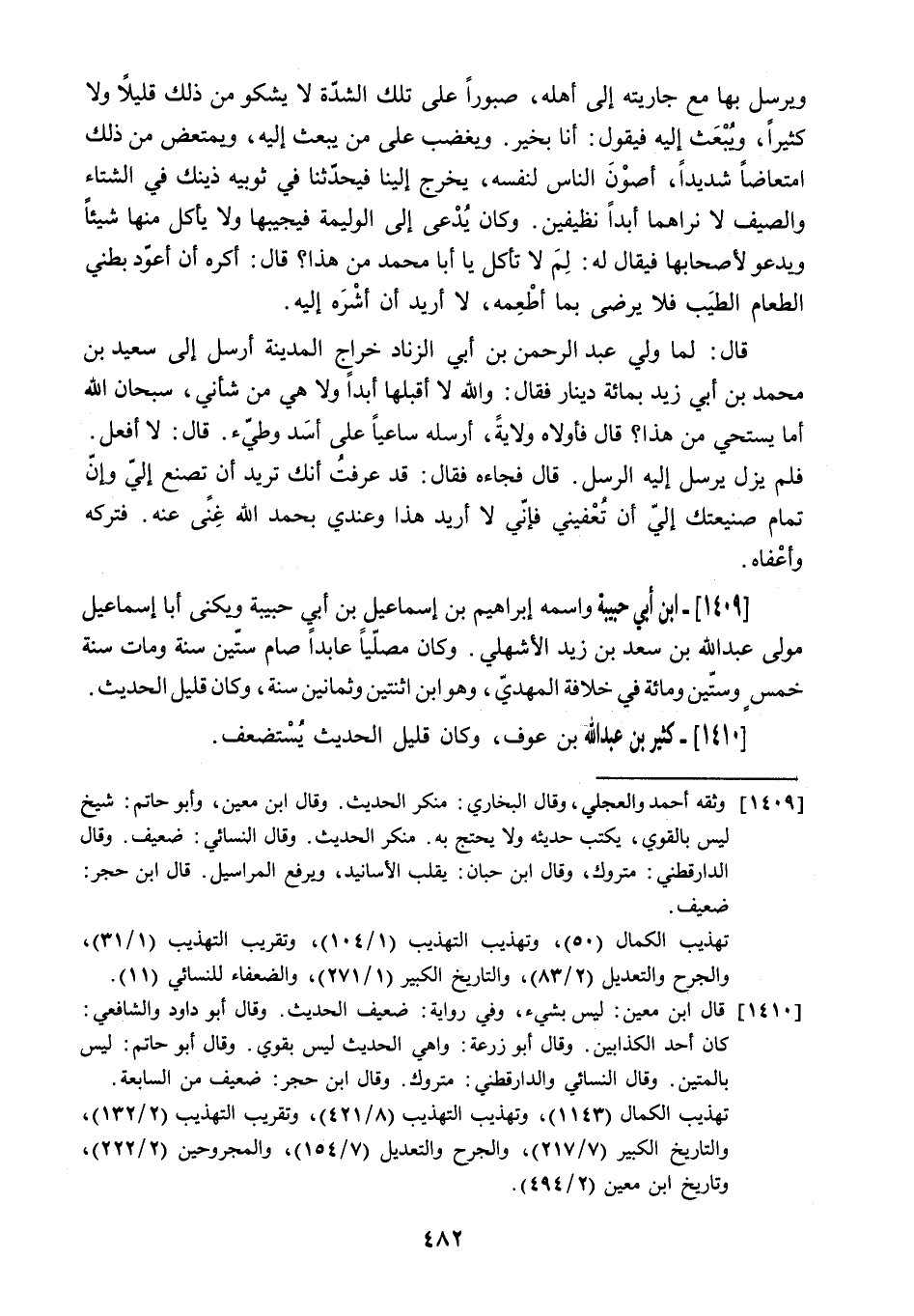 1409 وثقه أحمد والعجلي، وقال البخاري: منكر الحديث. وقال ابن معين، وأبو حاتم: شيخ ليس بالقوي، يكتب حديثه ولا يحتج به. منكر الحديث. وقال النسائي: ضعيف. وقال الدارقطني: متروك، وقال ابن حبان: يقلب الأسانيد، ويرفع المراسيل. قال ابن حجر: