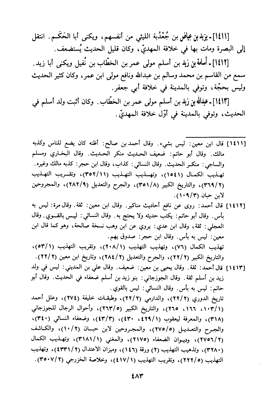 1413 قال أحمد: ثقة. وقال يحيى بن معين: ضعيف. وقال علي بن المديني: ليس في ولد زيد بن أسلم ثقة. وقال الجوزجاني. بنو زيد بن أسلم ضعفاء في الحديث. وقال أبو حاتم: ليس به بأس. وقال النسائي: ليس بالقوي.