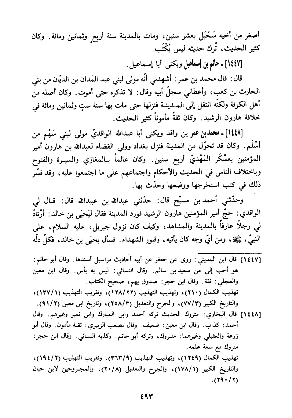 بْنِ وَاقِدٍ ويكنى أبا عبد الله الواقدي مولى لبني سهم من أسلم. وكان قد تحول من المدينة فنزل بغداد وولي القضاء لعبد الله بن هارون أمير المؤمنين بعسكر المهدي أربع سنين. وكان عالمًا بالمغازي والسيرة والفتوح وباختلاف الناس في الحديث والأحكام واجتماعهم على ما اجتمعوا عليه. وقد فسر ذلك في كتب استخرجها ووضعها وحدث بها.