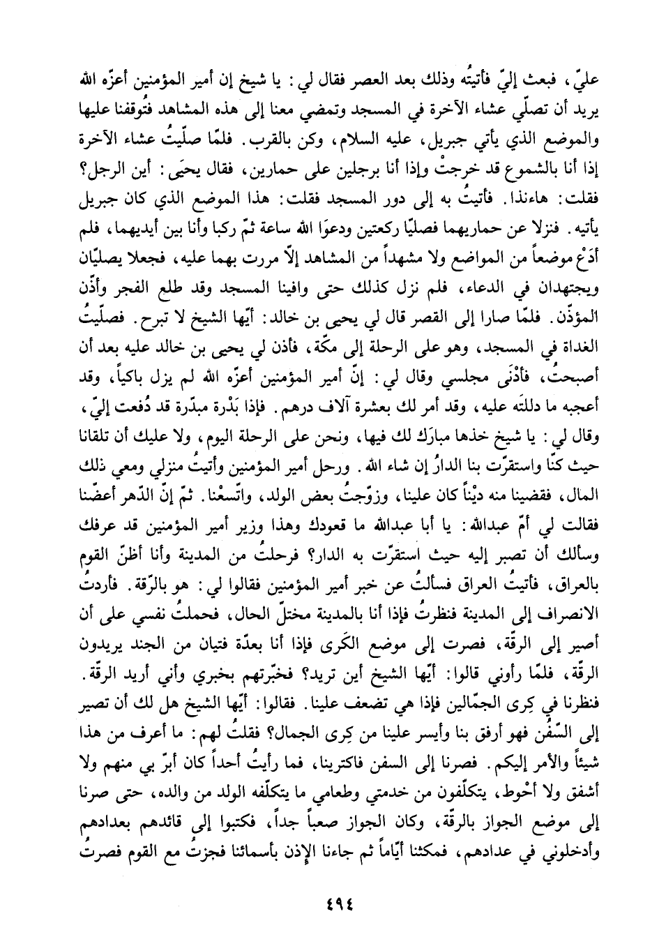 عَلَيَّ. فَبَعَثَ إِلَيَّ فَأَتَيْتُهُ وَذَلِكَ بَعْدَ الْعَصْرِ فَقَالَ لِي: يَا شَيْخُ إِنَّ أَمِيرَ الْمُؤْمِنِينَ أَعَزَّهُ اللَّهُ يُرِيدُ أَنْ تُصَلِّيَ عِشَاءَ الآخِرَةِ فِي الْمَسْجِدِ وَتَمْضِي مَعَنَا إِلَى هَذِهِ الْمَشَاهِدِ فتوقفنا عليها والموضع الذي يأتي جبريل. ع. وَكُنْ بِالْقُرْبِ. فَلَمَّا صَلَّيْتُ عِشَاءَ الآخِرَةِ إِذَا أَنَا بِالشُّمُوعِ قَدْ خَرَجَتْ وَإِذَا أَنَا بِرَجُلَيْنِ عَلَى حِمَارَيْنِ. فَقَالَ يَحْيَى: أَيْنَ الرَّجُلُ؟