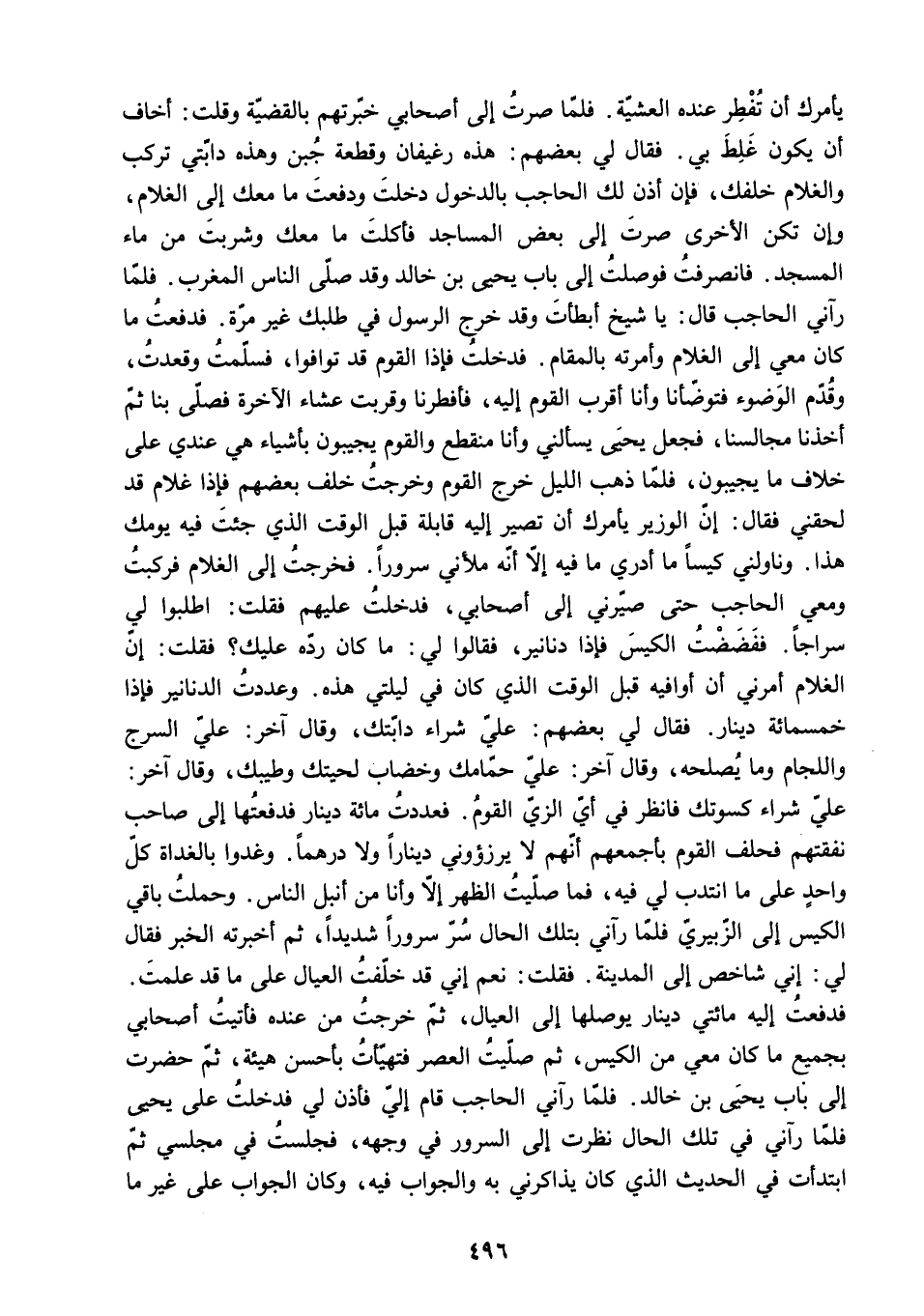 وَإِنْ تَكُنِ الأُخْرَى صِرْتَ إِلَى بَعْضِ الْمَسَاجِدِ فَأَكَلْتَ مَا مَعَكَ وَشَرِبْتَ مِنْ مَاءِ الْمَسْجِدِ. فَانْصَرَفْتُ فَوَصَلْتُ إِلَى بَابِ يَحْيَى بْنِ خَالِدٍ وَقَدْ صَلَّى النَّاسُ الْمَغْرِبَ. فَلَمَّا رَآنِي الْحَاجِبُ قَالَ: يَا شَيْخُ أَبْطَأْتَ وَقَدْ خَرَجَ الرَّسُولُ فِي طَلَبِكَ غَيْرَ مَرَّةٍ. فَدَفَعْتُ مَا كَانَ مَعِي إِلَى الْغُلامِ وَأَمَرْتُهُ بِالْمُقَامِ. فَدَخَلْتُ فَإِذَا الْقَوْمُ قَدْ تَوَافَوْا. فَسَلَّمْتُ وَقَعَدْتُ.