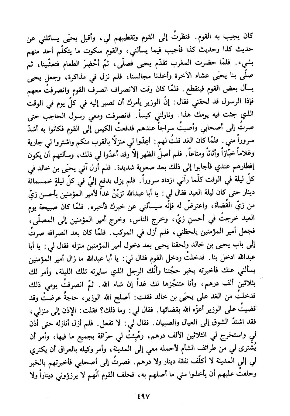 كَانَ يُجِيبُ بِهِ الْقَوْمُ. فَنَظَرْتُ إِلَى الْقَوْمِ وَتَقْطِيبِهِمْ لِي. وَأَقْبَلَ يَحْيَى يُسَائِلُنِي عَنْ حَدِيثِ كَذَا وَحَدِيثِ كَذَا فَأُجِيبُ فِيمَا يَسْأَلُنِي. وَالْقَوْمُ سُكُوتٌ مَا يَتَكَلَّمُ أَحَدٌ مِنْهُمْ بِشَيْءٍ. فَلَمَّا حَضَرَتِ الْمَغْرِبُ تَقَدَّمَ يَحْيَى فَصَلَّى. ثُمَّ أَحْضَرَ الطَّعَامَ فَتَعَشَّيْنَا. ثُمَّ صَلَّى بِنَا يَحْيَى عِشَاءَ الآخِرَةِ وَأَخَذْنَا مَجَالِسَنَا. فَلَمْ نَزَلْ فِي مُذَاكَرَةٍ. وَجَعَلَ يَحْيَى يَسْأَلُ بَعْضَ الْقَوْمِ فَيَنْقَطِعُ. فَلَمَّا كَانَ وَقْتُ الانْصِرَافِ انْصَرَفَ الْقَوْمُ وَانْصَرَفْتُ مَعَهُمْ فَإِذَا الرَّسُولُ قَدْ لَحِقَنِي فَقَالَ: إِنَّ الْوَزِيرَ يَأْمُرُكَ أَنْ تَصِيرَ إِلَيْهِ فِي كُلِّ يَوْمٍ فِي الْوَقْتِ الَّذِي جِئْتَ فِيهِ يَوْمَكَ هَذَا. وَنَاوَلَنِي كِيسًا. فَانْصَرَفْتُ وَمَعِي رَسُولُ الْحَاجِبِ حَتَّى صِرْتُ إِلَى أَصْحَابِي وَأَصَبْتُ سِرَاجًا عِنْدَهُمْ فَدَفَعْتُ الْكِيسَ إِلَى الْقَوْمِ فَكَانُوا بِهِ أَشَدَّ سُرُورًا مِنِّي. فَلَمَّا كَانَ الْغَدُ قُلْتُ لَهُمْ: أَعِدُّوا لِي مَنْزِلا بِالْقُرْبِ مِنْكُمْ وَاشْتَرُوا لِي جَارِيَةً وَغُلامًا خَبَّازًا وَأَثَاثًا وَمَتَاعًا. فَلَمْ أُصَلِّ الظُّهْرَ إِلا وَقَدْ أَعَدُّوا لِي ذَلِكَ. وَسَأَلْتُهُمْ أَنْ يَكُونَ إِفْطَارُهُمْ عِنْدِي فَأَجَابُوا إِلَى ذَلِكَ بَعْدَ صُعُوبَةٍ شَدِيدَةٍ. فَلَمْ أَزَلْ آتِي يَحْيَى بْنَ خَالِدٍ فِي كُلِّ لَيْلَةٍ فِي الْوَقْتِ كُلَّمَا رَآنِي ازْدَادَ سُرُورًا. فَلَمْ يَزَلْ يَدْفَعُ إِلَيَّ فِي كُلِّ لَيْلَةٍ خَمْسَمِائَةِ دِينَارٍ حَتَّى كَانَ لَيْلَةُ الْعِيدِ فَقَالَ لِي: يَا أَبَا عَبْدِ اللَّهِ تَزَيَّنْ غَدًا لأَمِيرِ الْمُؤْمِنِينَ بِأَحْسَنِ زِيٍّ مِنْ زِيِّ الْقُضَاةِ. وَاعْتَرِضْ لَهُ فَإِنَّهُ سَيَسْأَلُنِي عَنْ خَبَرِكَ فَأُخْبِرُهُ. فَلَمَّا كَانَ صَبِيحَةُ يَوْمِ الْعِيدِ خَرَجْتُ فِي أَحْسَنِ زِيٍّ. وَخَرَجَ النَّاسُ. وَخَرَجَ أَمِيرُ الْمُؤْمِنِينَ إِلَى الْمُصَلَّى.
