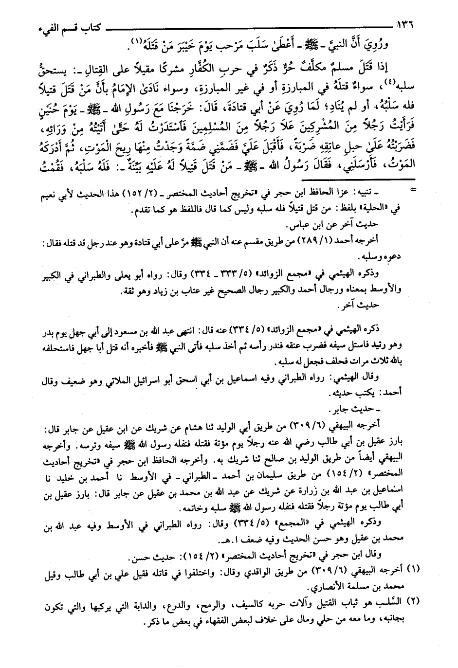 إذا قتل مسلم مكلف حر ذكرٌ في حرب الكفار مشركاً مقيلاً على القتال-: يستحق سلبه، سواء قتله في المبارزة أو في غير المبارزة، وسواء نادى الإمام بأن من قتل قتيلاً فله سلبه، أو لم يُناد؛ لما روي عن أبي قتادة، قال: خرجنا مع رسول الله -صلى الله عليه وسلم - يوم حُنين فرأيت رجلاً من المشركين علا رجلاً من المسلمين فاستدرت له حتى أتيته من ورائه، فضربته على حبل عاتقه ضربةً، فأقبل علي فضمني ضمة وجدت منها ريح الموت، ثم أدركه الموت، فأرسلني، فقال رسول الله - صلى الله عليه وسلم- من قتل قتيلاً له عليه بينة-: فله سلبه، فقمت