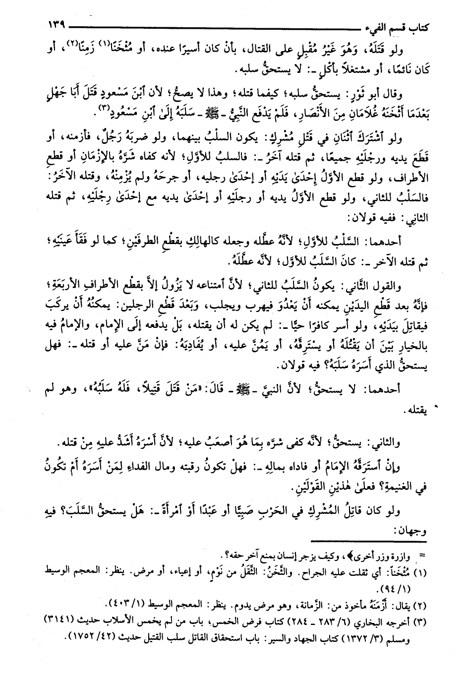 ولو اشترك اثنان في قتل مُشركٍ: يكون السلب بينهما، ولو ضربه رجل، فأزمنه، أو قطع يديه ورجليه جميعاً، ثم قتله آخر-: فالسلب للأول؛ لأنه كفاه شره بالإزمان أو قطع الأطراف، ولو قطع الأول إحدى يديه أو إحدى رجليه، أو جرحه ولم يُزمنه، وقتله الآخر: فالسلب للثاني، ولو قطع الأول يديه أو رجليه أو إحدى يديه مع إحدى رجليه، ثم قتله الثاني: ففيه قولان: