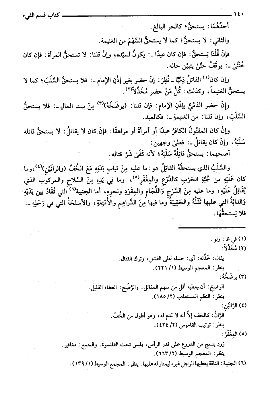والسلب الذي يستحقه القاتل هو: ما عليه من ثياب بدنه مع الخف (والرانين)، وما كان عليه من جُبة الحرب كالدرع والمغفر، وما في يده من السلاح والمركوب الذي يُقاتل عليه، وما عليه من السرج واللجام والمقود ونحوه، أما الجنيبة التي تُقاد بين يديه والدابة التي عليها ثقله والحقيبة وما فيها من الدراهم والأمتعة، والأسلحة التي في رحله -: فلا يستحقها.