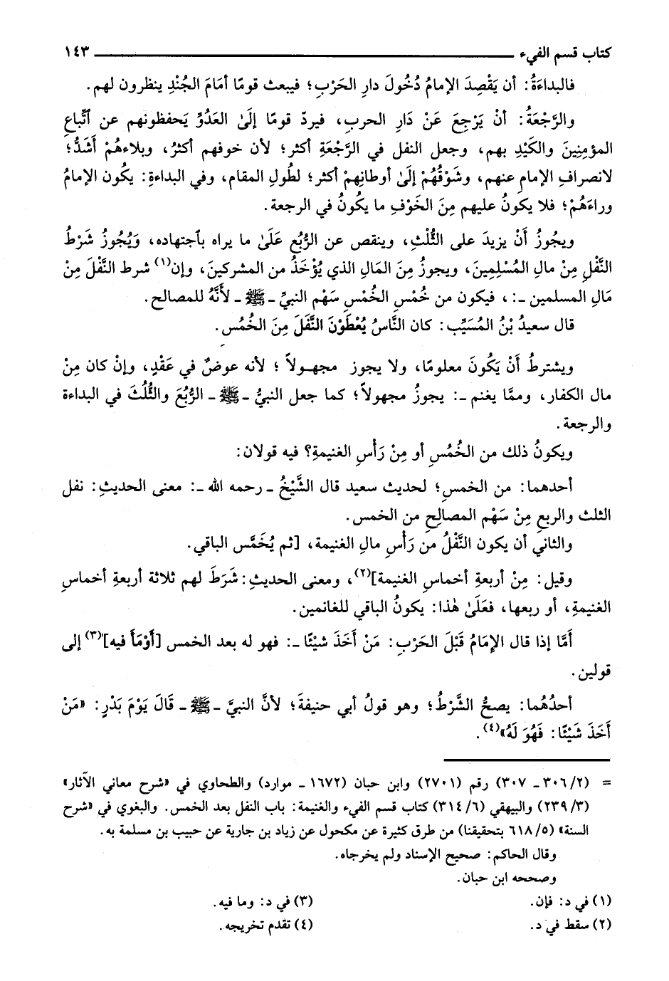 ويجوز أن يزيد على الثلث، وينقص عن الربع على ما يراه باجتهاده، ويجوز شرط النفل من مال المسلمين، ويجوز من المال الذي يؤخذ من المشركين، وإن شرط النفل من مال المسلمين-: فيكون من خُمس الخمس سهم النبي - صلى الله عليه وسلم - لأنه للمصالح.
