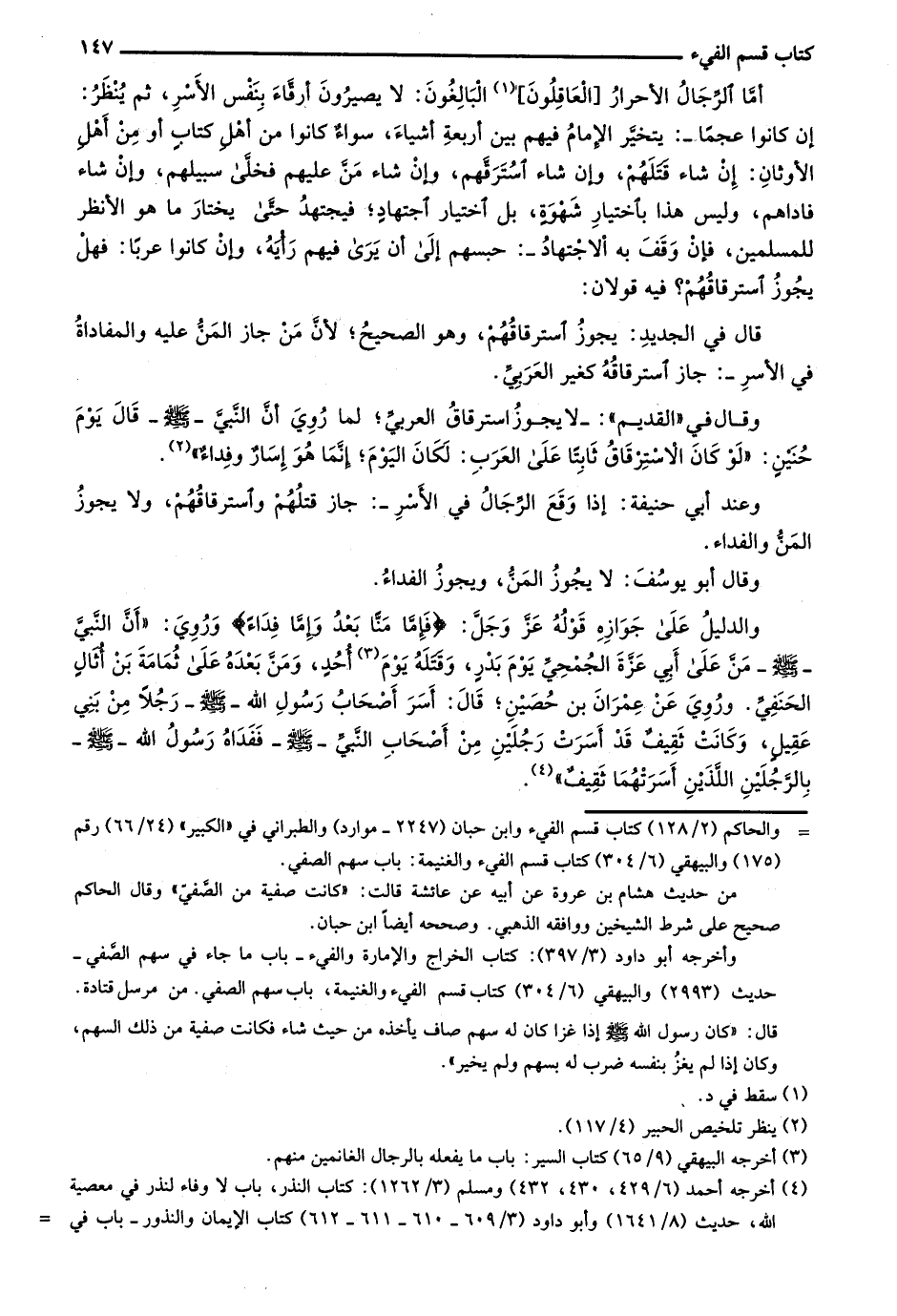 أما الرجال الأحرار [العاقلون] البالغون: لا يصيرون أرقاء بنفس الأسر، ثم يُنظر: إن كانوا عجماً-: يتخير الإمام فيهم بين أربعة أشياء، سواء كانوا من أهل كتاب أو من أهل الأوثان: إن شاء قتلهم، وإن شاء استرقهم، وإن شاء من عليهم فخلى سبيلهم، وإن شاء فاداهم، وليس هذا باختيار شهوة، بل اختيار اجتهاد؛ فيجتهد حتى يختار ما هو الأنظر للمسلمين، فن وقف به الاجتهاد-: حبسهم إلى أن يرى فيهم رأيه، وإن كانوا عرباً: فهل يجوز استرقاقهم؟ فيه قولان: