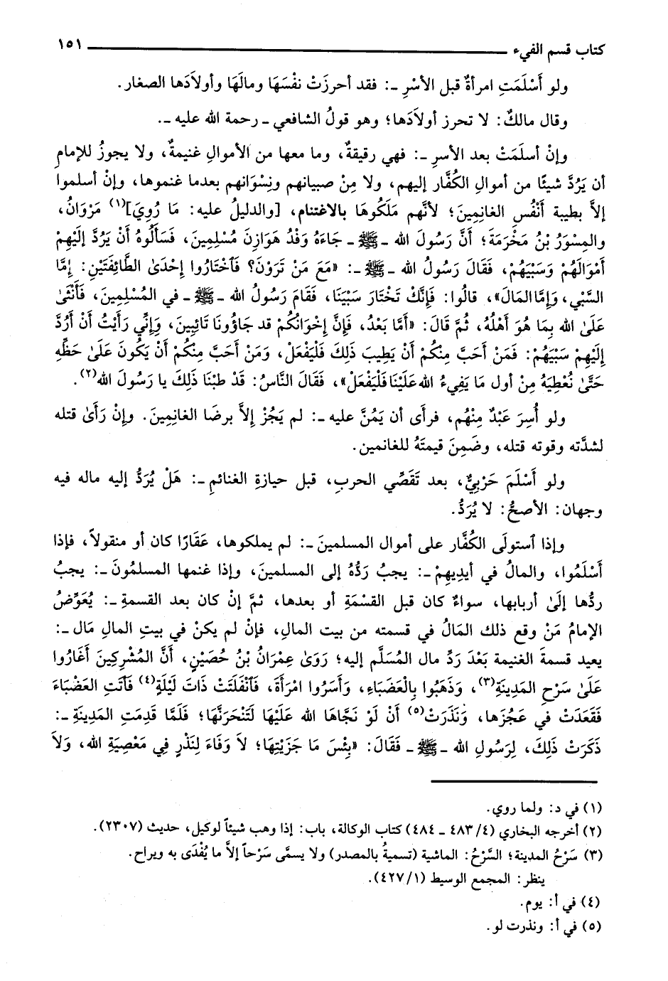 وإذا استولى الكفار على أموال المسلمين-: لم يملكوها، عقاراً كان أو منقولاً، فإذا أسلموا، والمال في أيديهم-: يجب رده إلى المسلمين، وإذا غنمها المسلمون-: يجب ردها إلى أربابها، سواء كان قبل القسمة أو بعدها، ثم إن كان بعد القسمة-: يُعوض الإمام من وقع ذلك المال في قسمته من بتي المال، فإن لم يكن في بيت المال مال-: يعيد قسمة الغنيمة بعد رد مال المسلم إليه؛ روى عمران بن حصين، أن المشركين أغاروا على سرح المدينة، وذهبوا بالعضباء، وأسروا امرأة، فانفلتت ذات ليلة فأتت العضباء فقعدت في عجزها، ونذرت أن لو نجاها الله عليها لتنحرنها؛ فلما قدمت المدينة- ذكرت ذلك، لرسول الله - صلى الله عليه وسلم- فقال: "بئس ما جزيتها؛ لا وفاء لنذرٍ في معصية الله، ولا